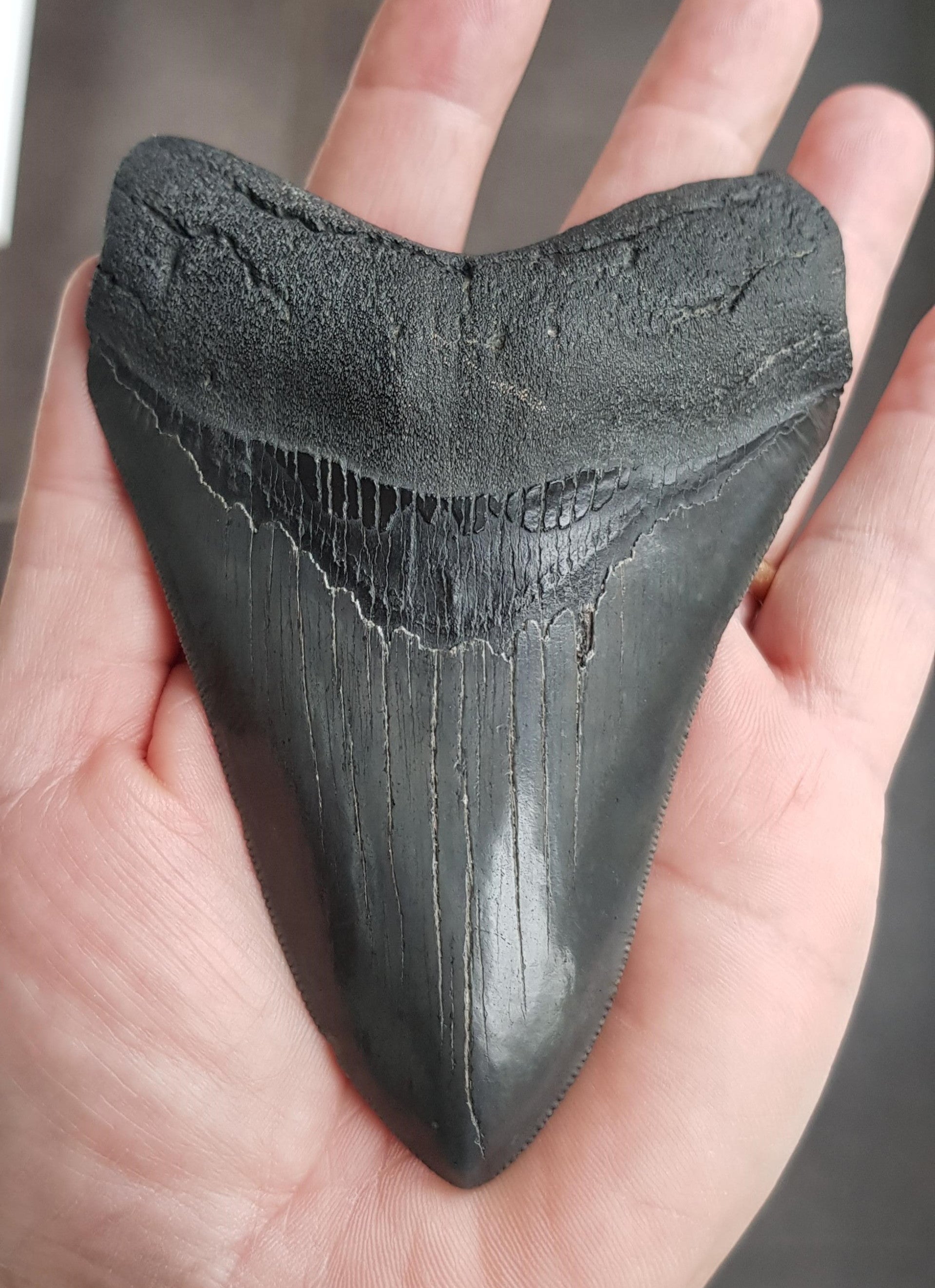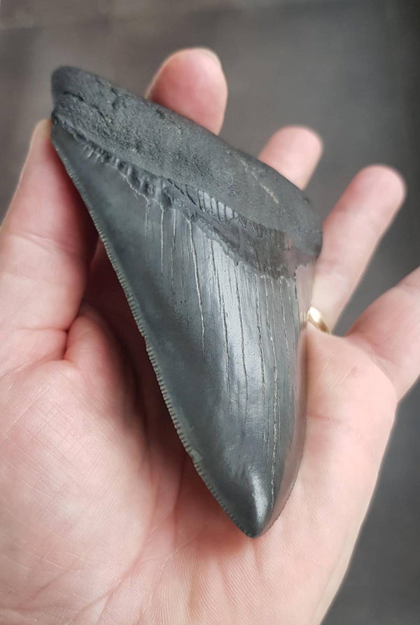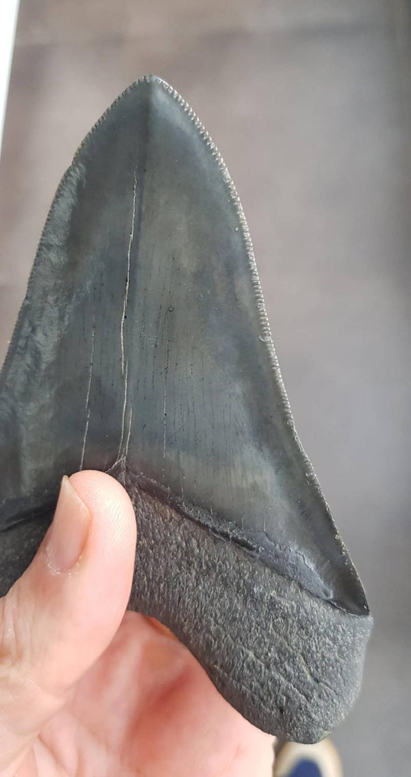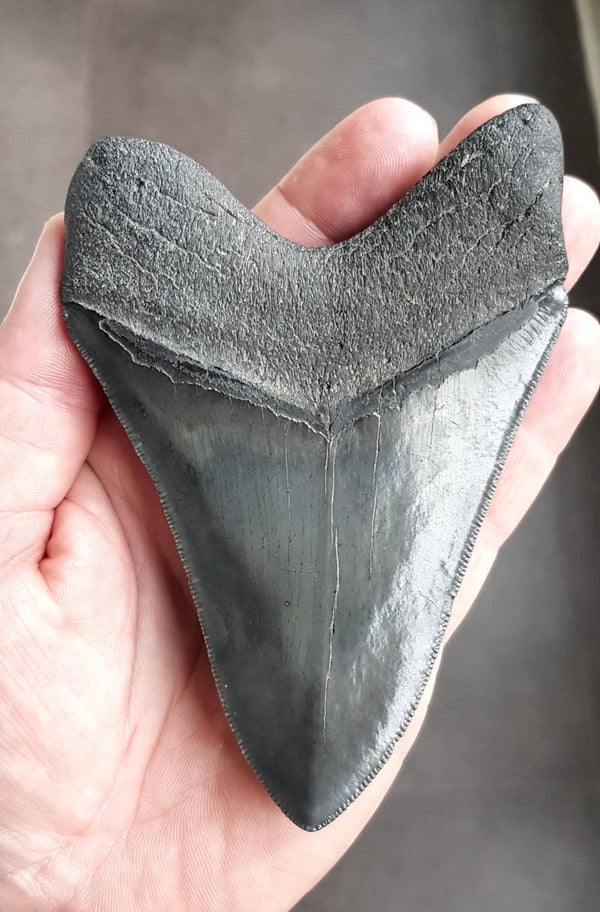 Extreem gekartelde Megalodon tand van 12.3 cm. Perfecte serraties