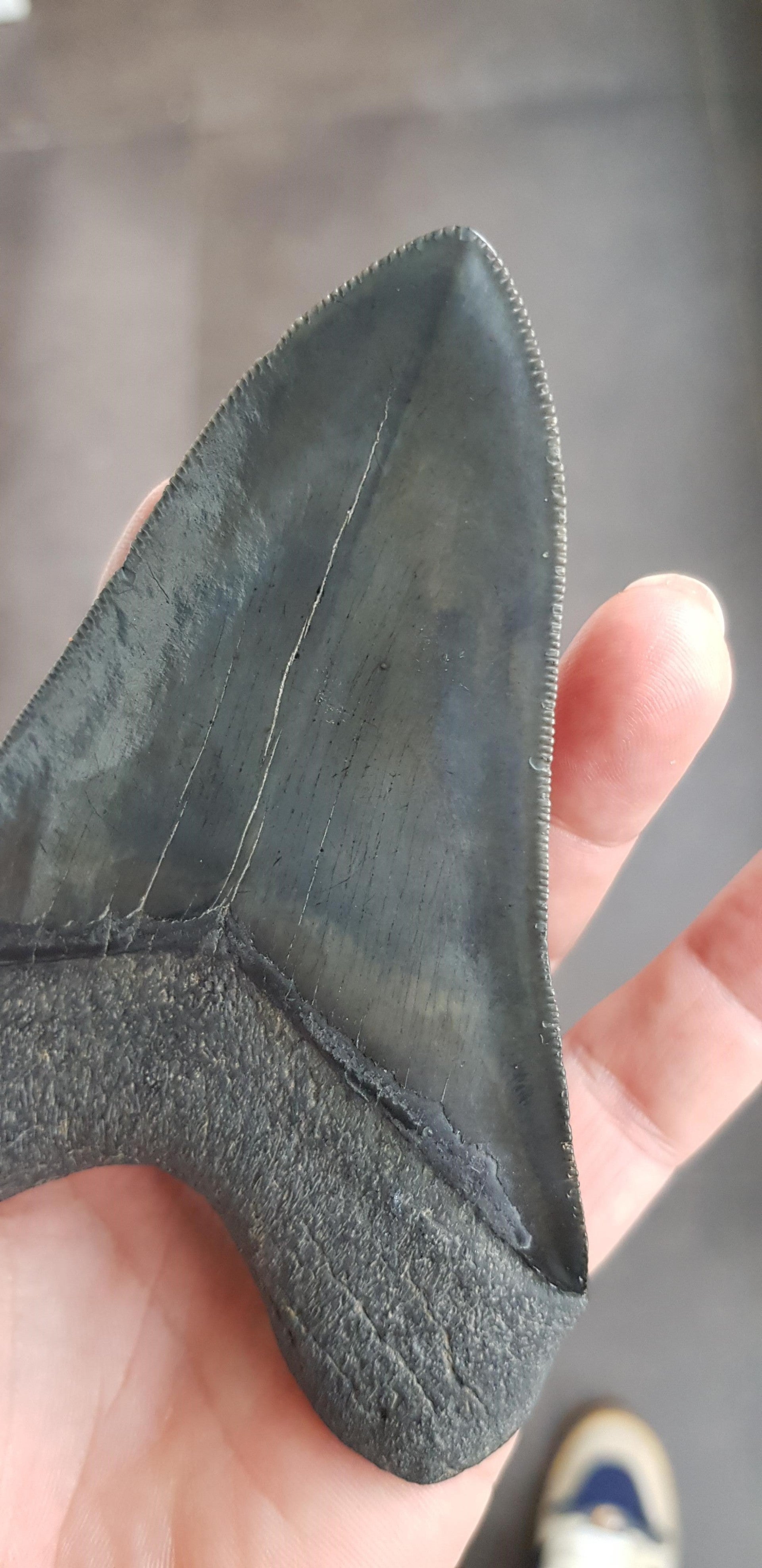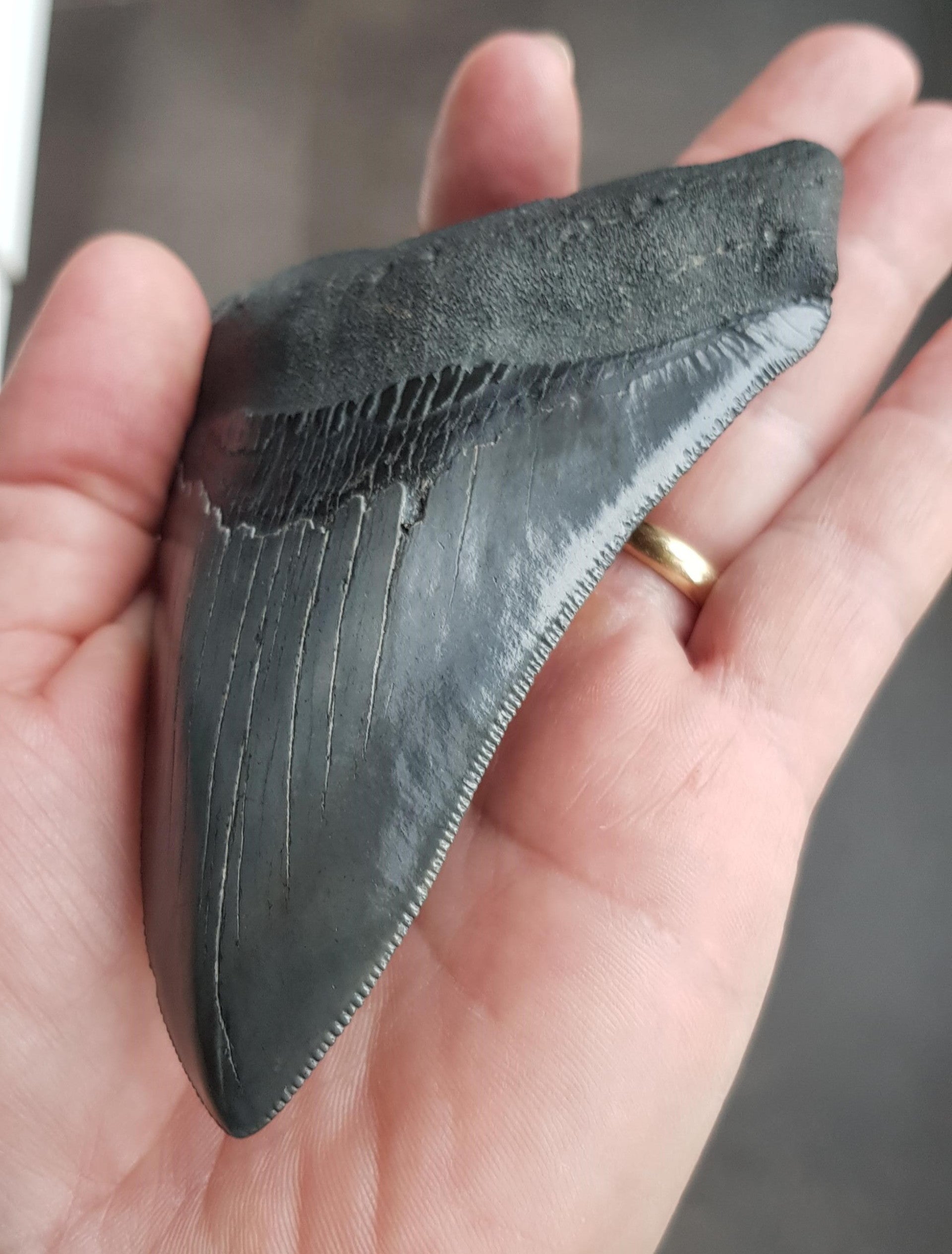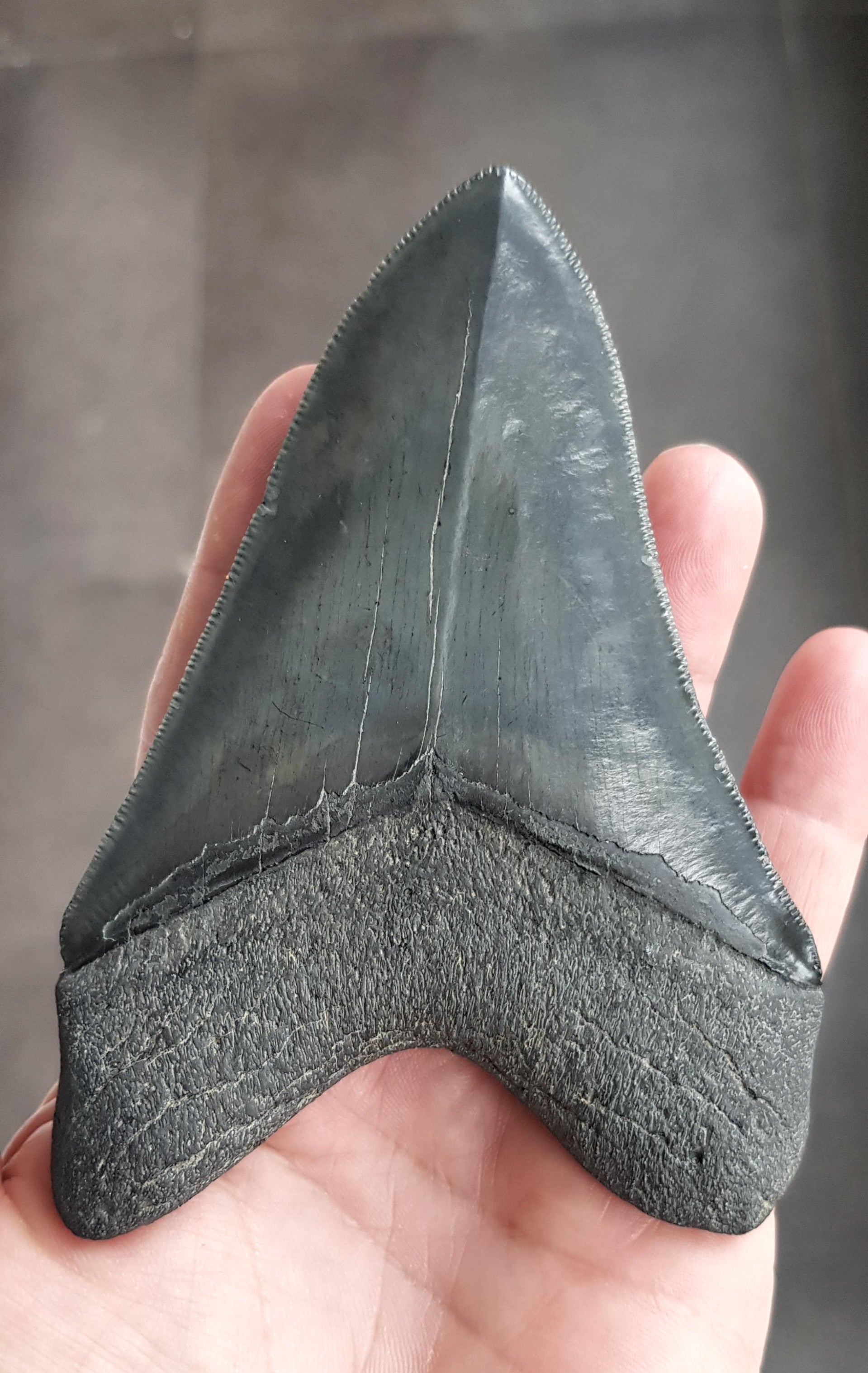 Extreem gekartelde Megalodon tand van 12.3 cm. Perfecte serraties