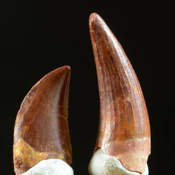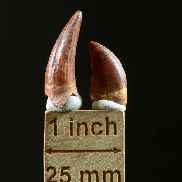 Mooie set van twee dinosaurus tanden uit de Kem Kem van Marokko.