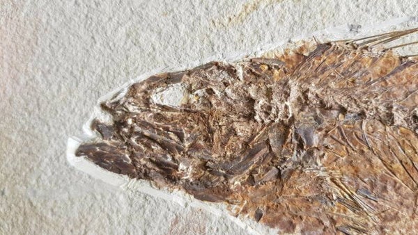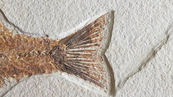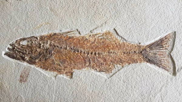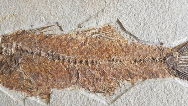 Goed behouden vis met zeer gedetailleerde botstructuur, wervels, vinnen en tanden erop.