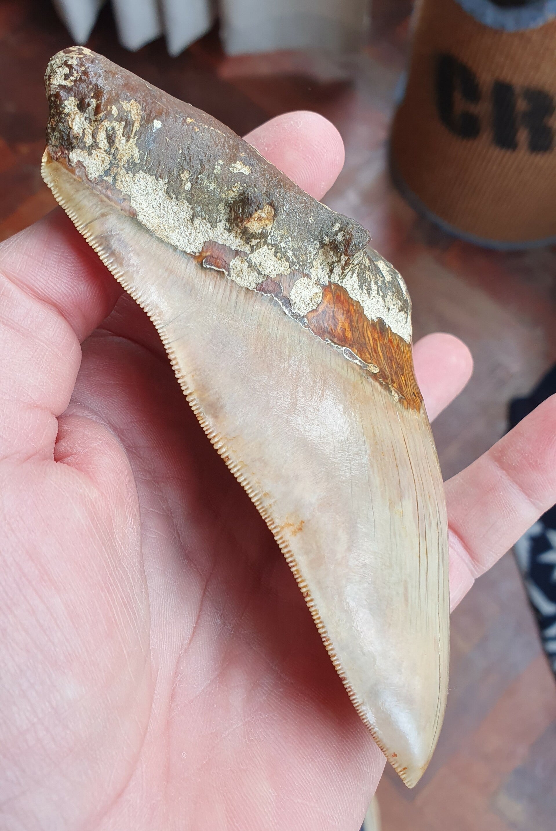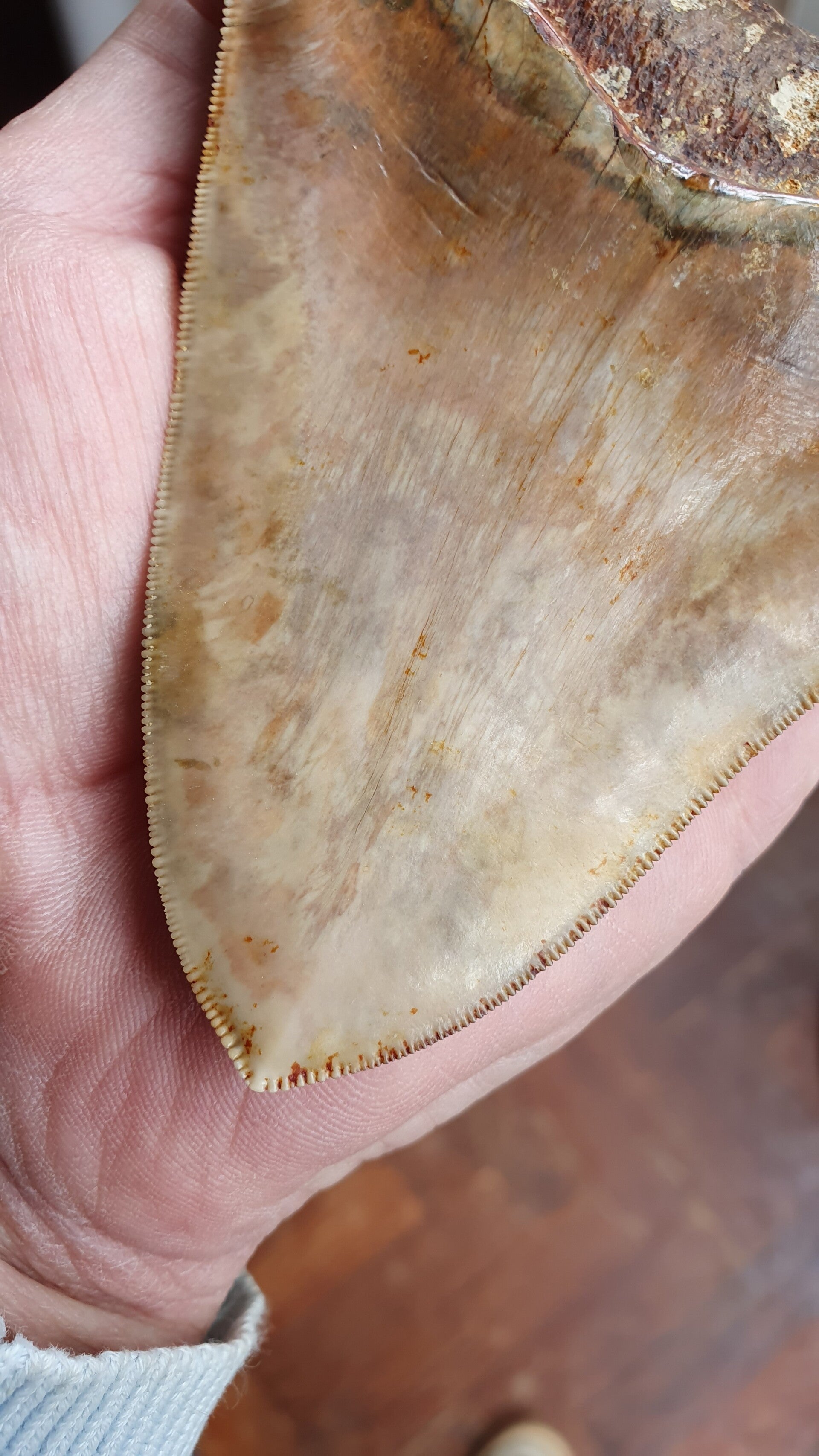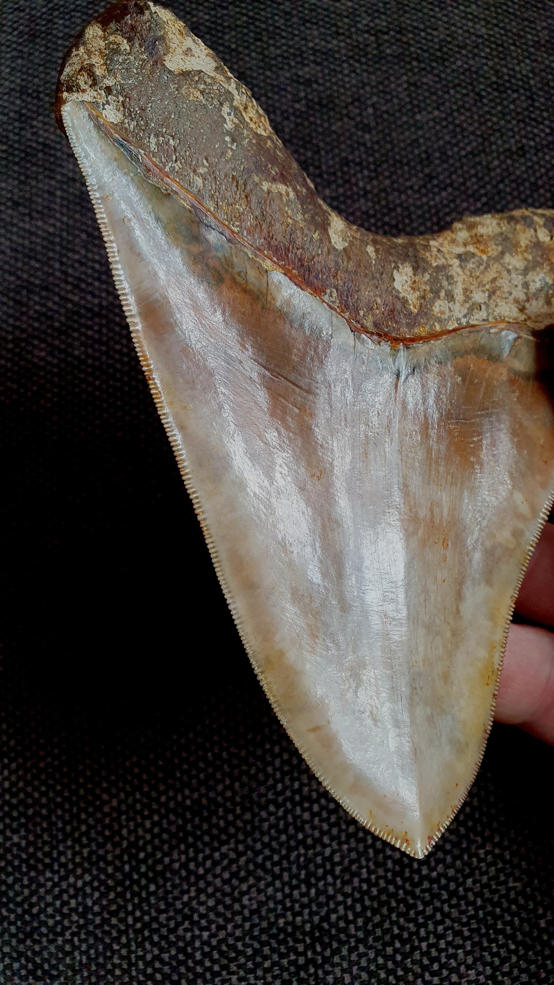 Grote Megalodon haaientand van 13.8 cm uit Indonesie. Perfecte kartels, bruine kleur enamel, mooie bourlette, en een scherpe punt.Geen reparatie. Herkomst Java, Indonesie, 5 mlijoen jaar oud