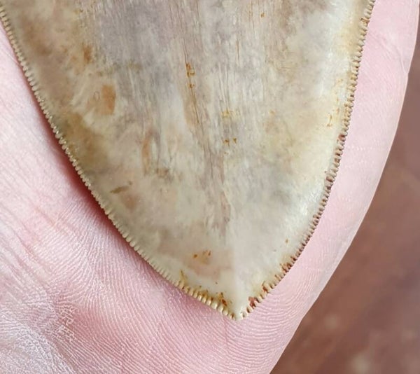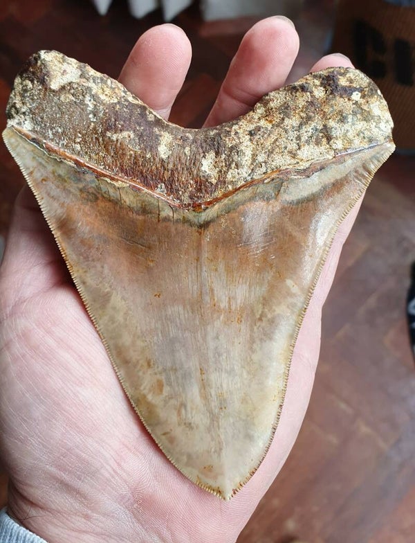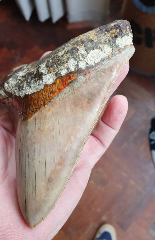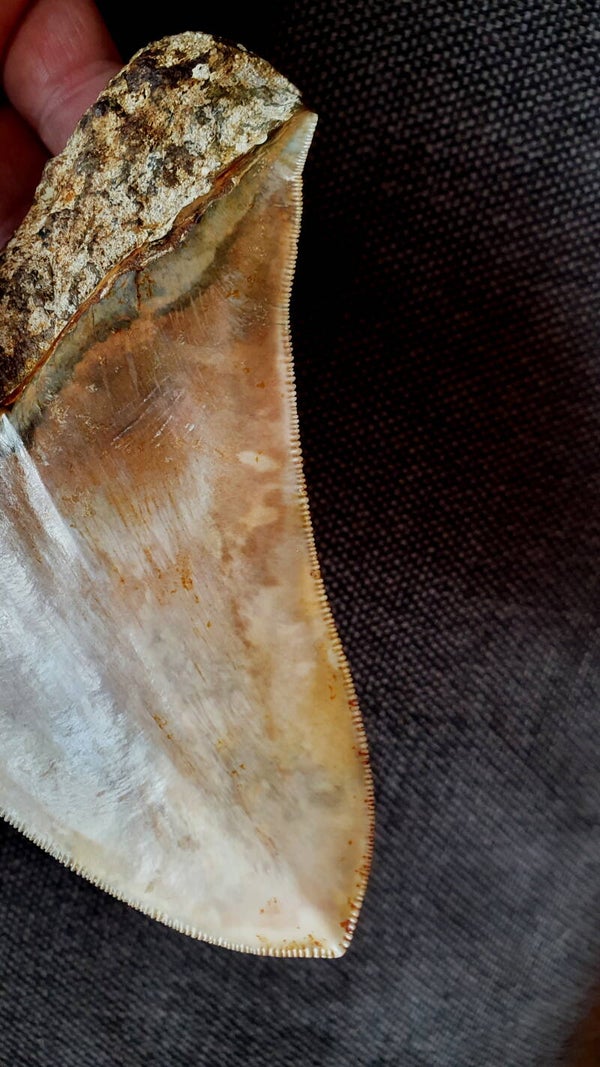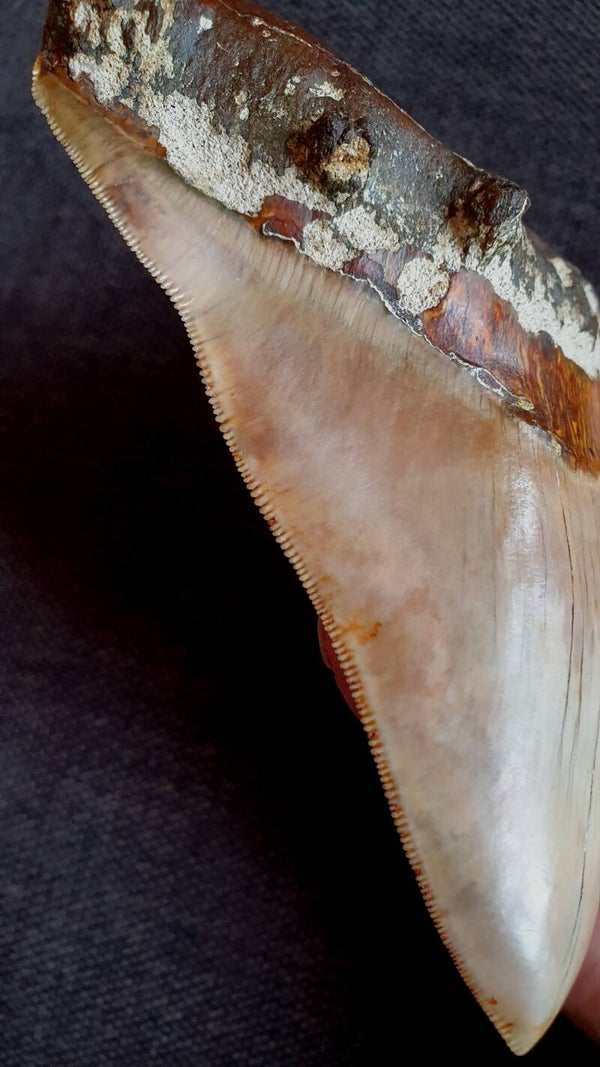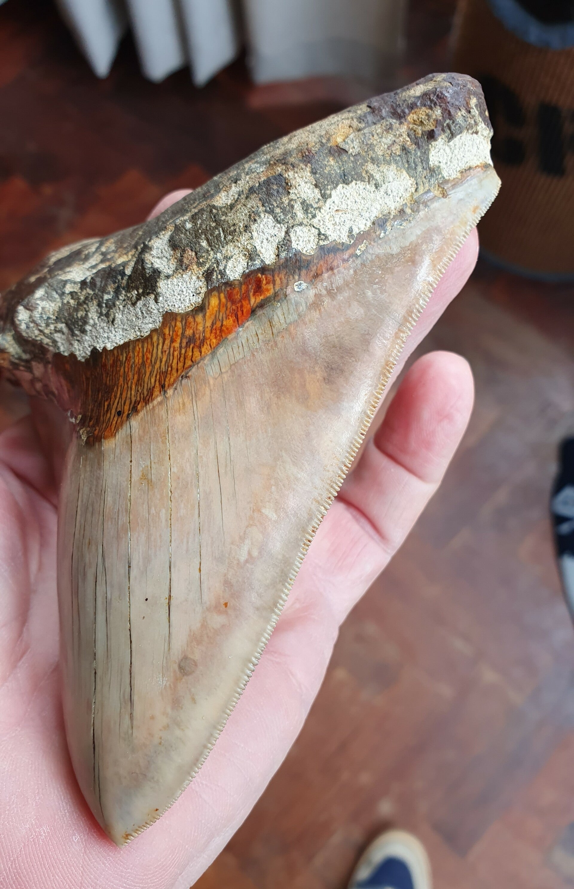 Grote Megalodon haaientand van 13.8 cm uit Indonesie. Perfecte kartels, bruine kleur enamel, mooie bourlette, en een scherpe punt.Geen reparatie. Herkomst Java, Indonesie, 5 mlijoen jaar oud