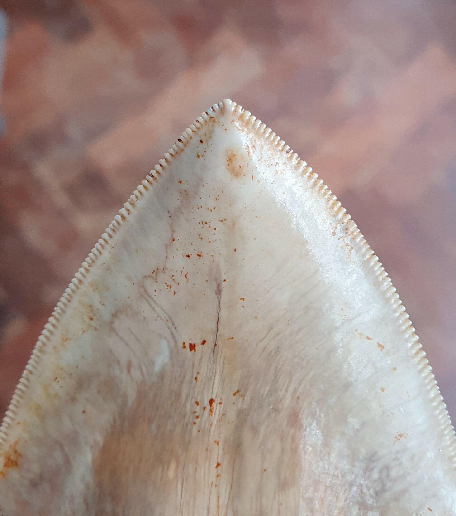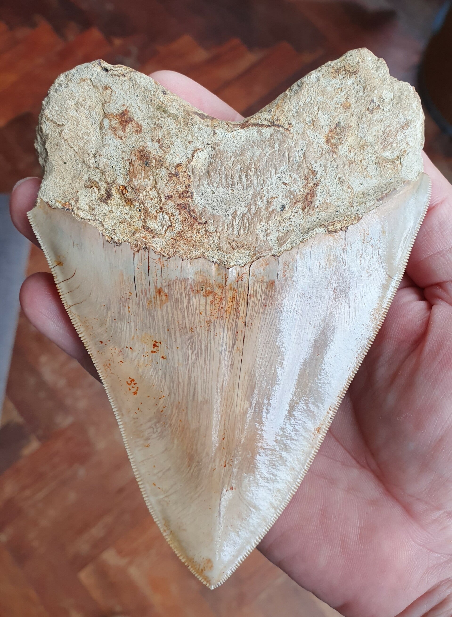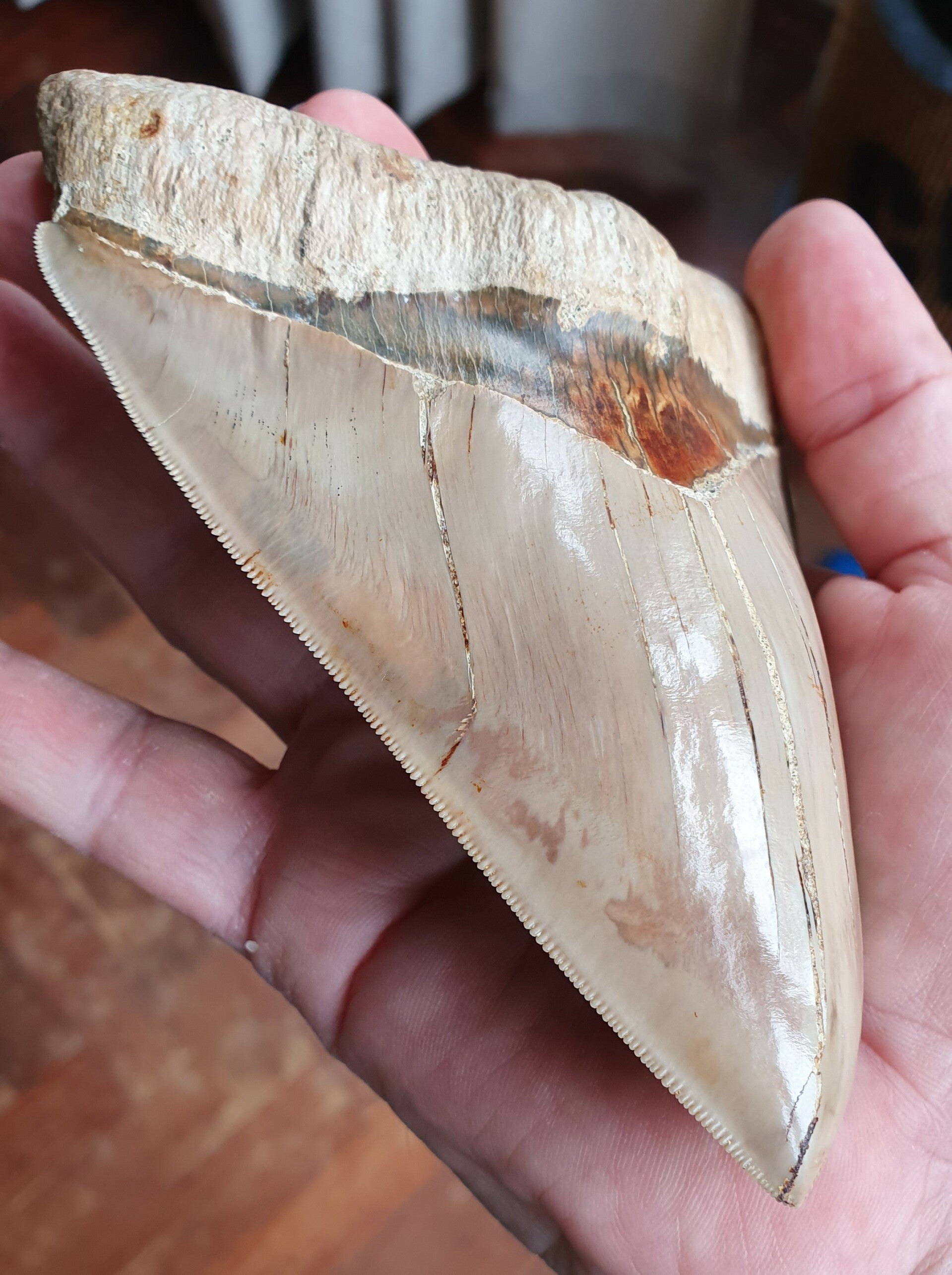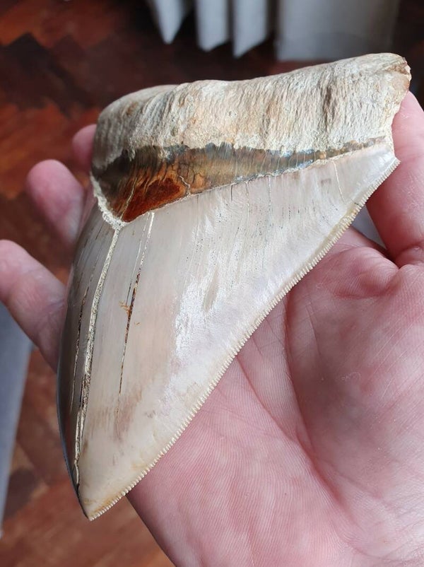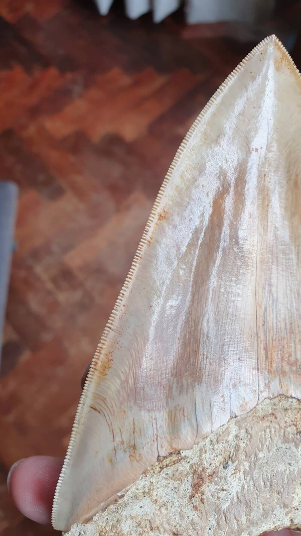 Grote Megalodon haaientand van 14.6 cm uit Indonesie. Perfecte kartels en wortel, lichte kleur enamel, mooie bourlette, en een scherpe punt.Geen reparatie. Herkomst Java, Indonesie, 5 mlijoen jaar oud