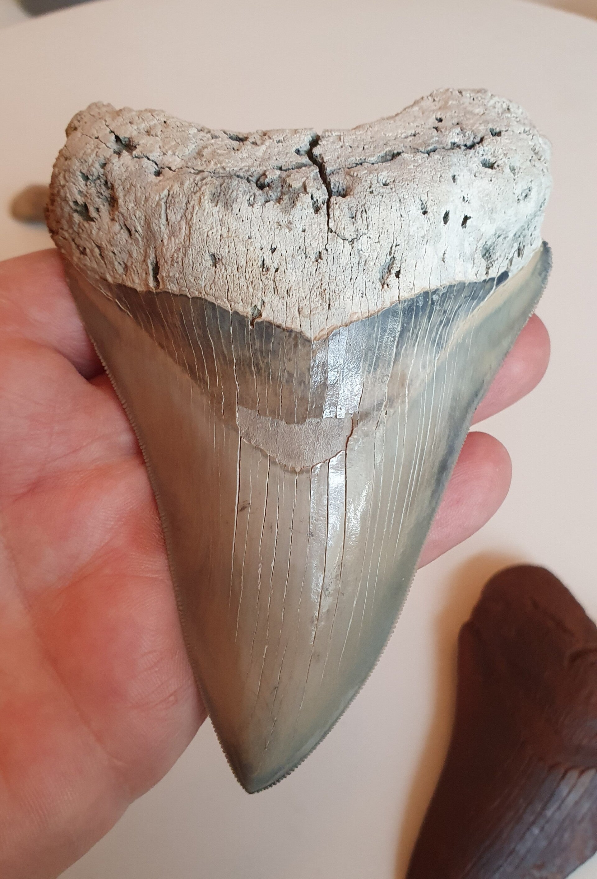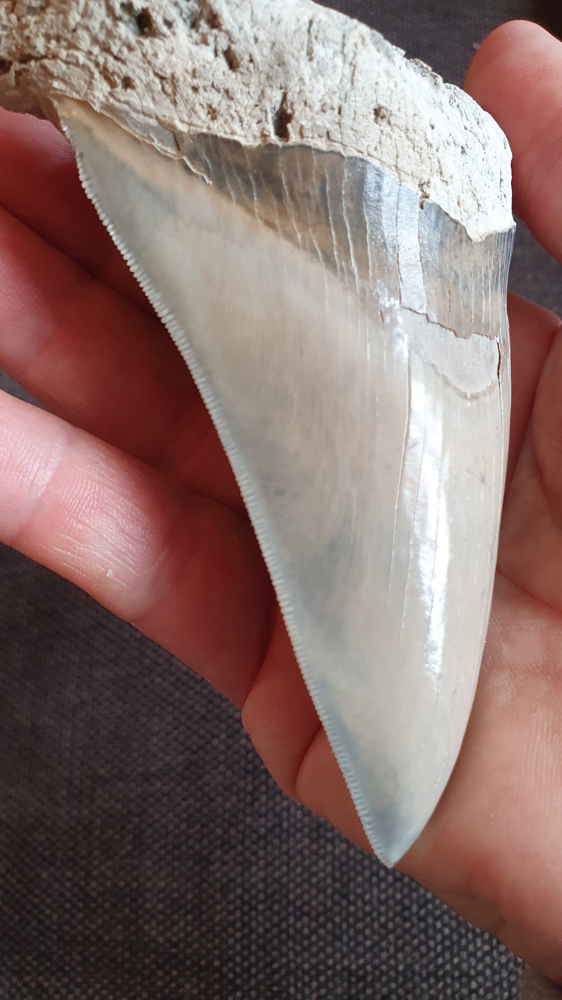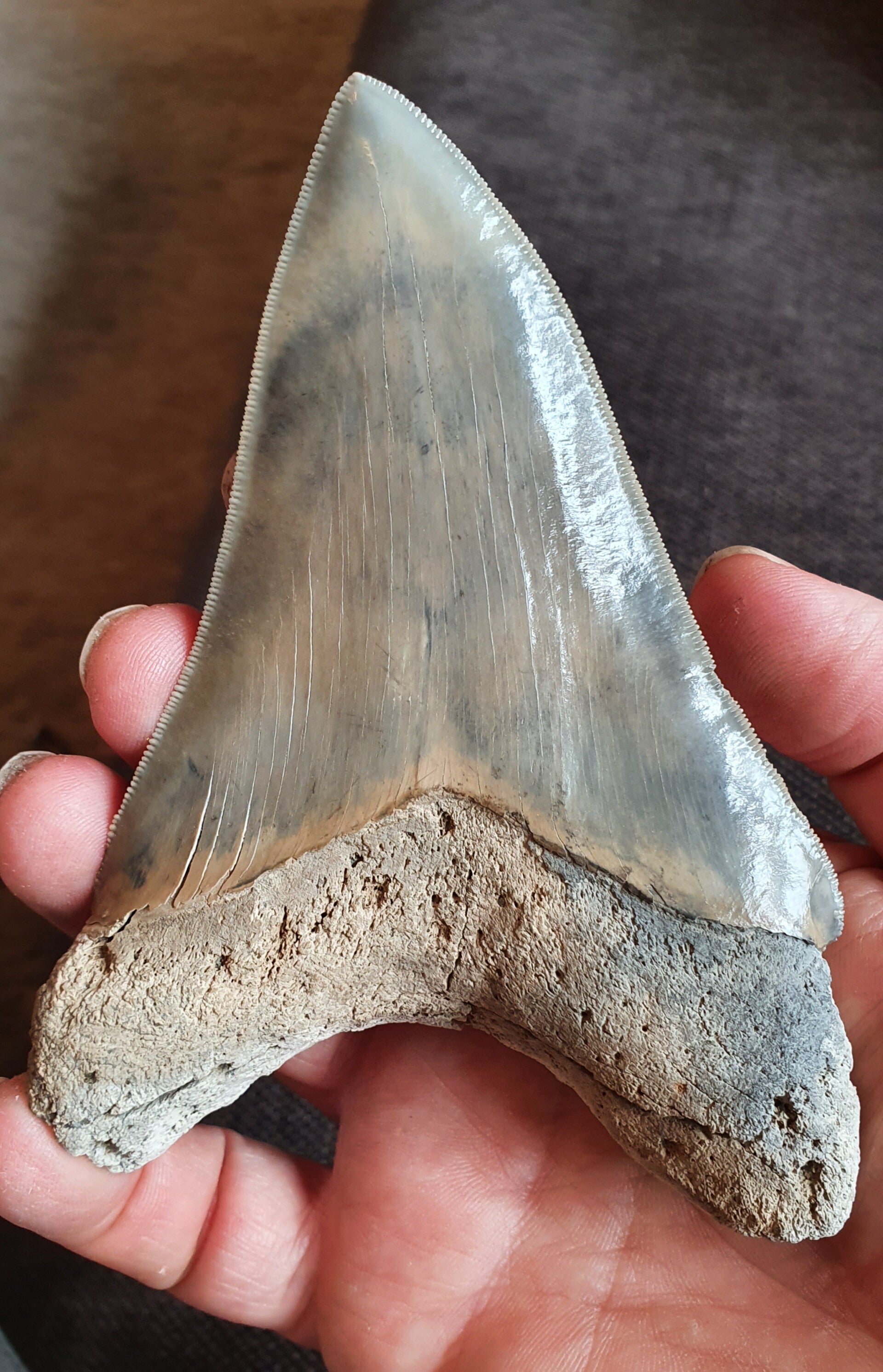Extreem zeldzame megalodon uit de gesloten Lee Creek fosfaat mijn, Aurora, North Carolina, USA. Afmeting 12,5 cm. Er komen al jaren geen tanden op de markt uit Lee Creek omdat de mijn gesloten is. Deze is dan ook uit een oude collectie.