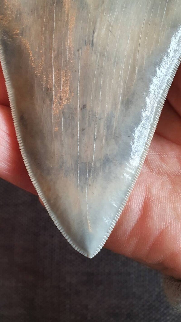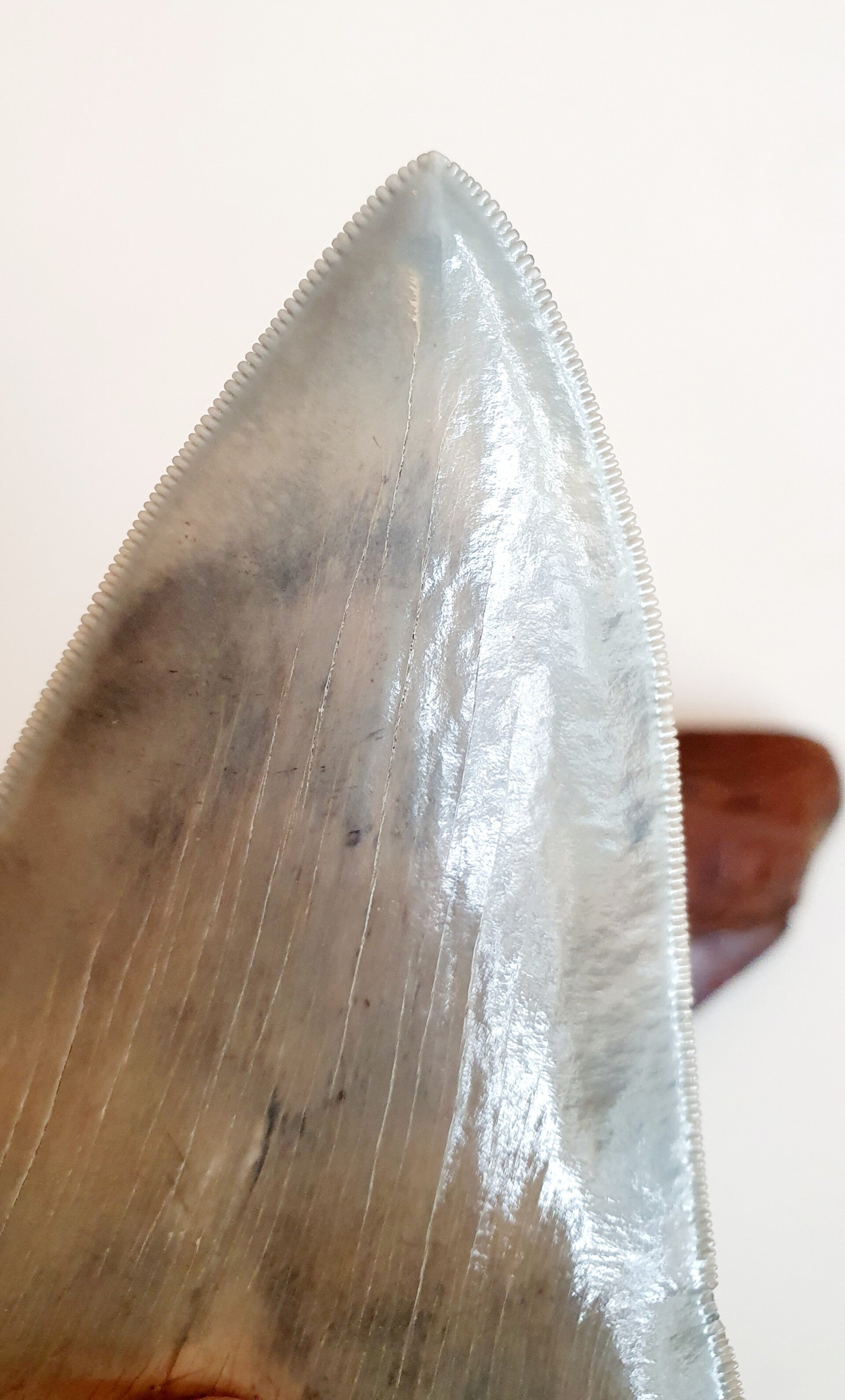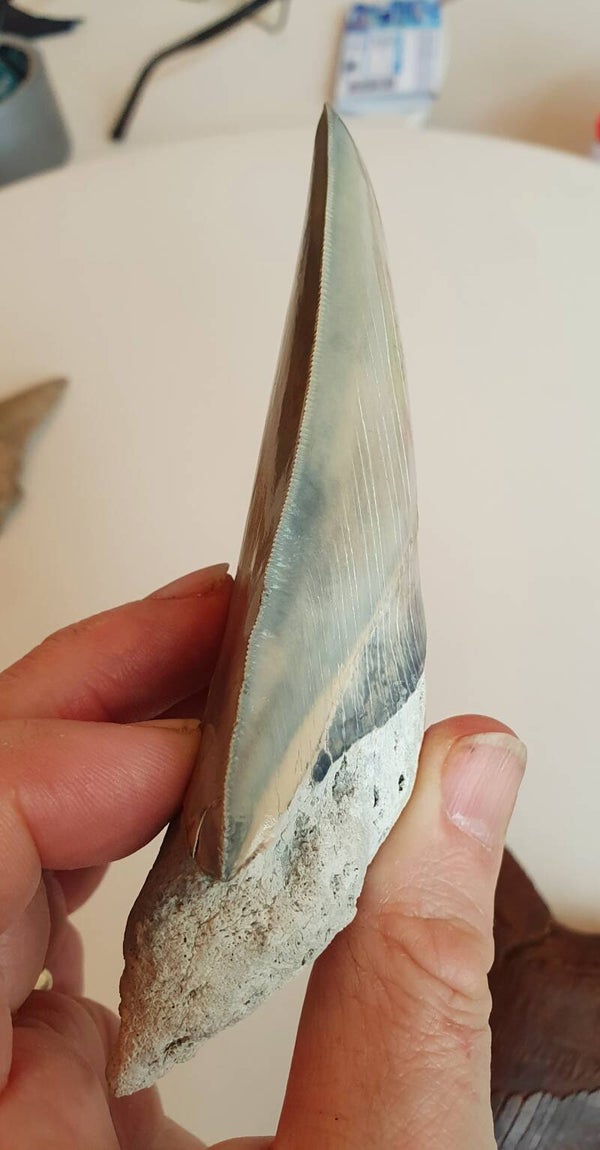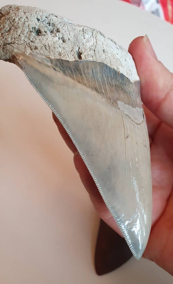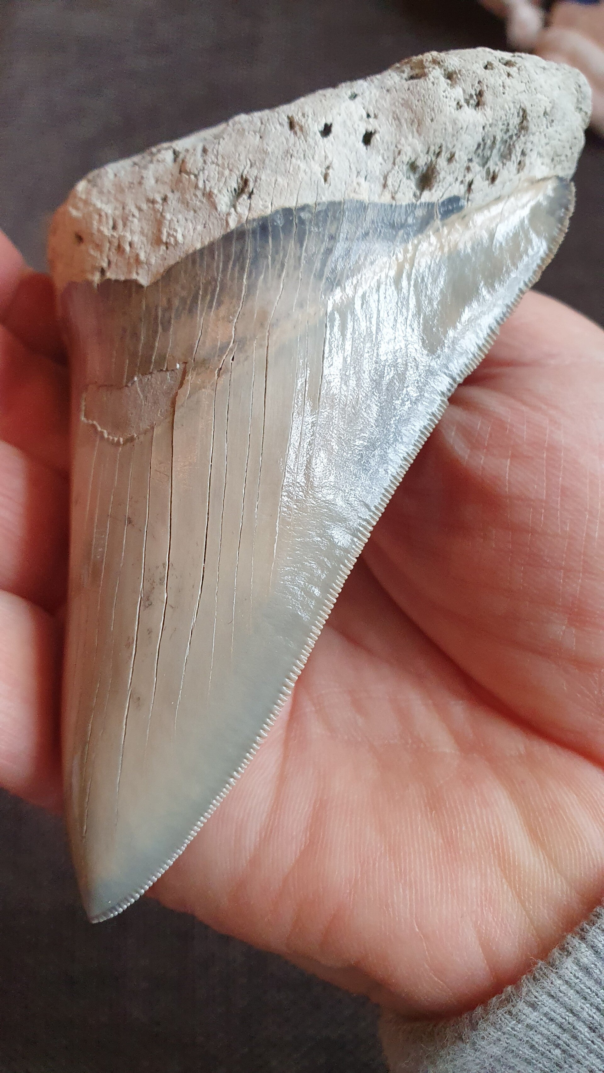 Extreem zeldzame megalodon uit de gesloten Lee Creek fosfaat mijn, Aurora, North Carolina, USA. Afmeting 12,5 cm. Er komen al jaren geen tanden op de markt uit Lee Creek omdat de mijn gesloten is. Deze is dan ook uit een oude collectie.