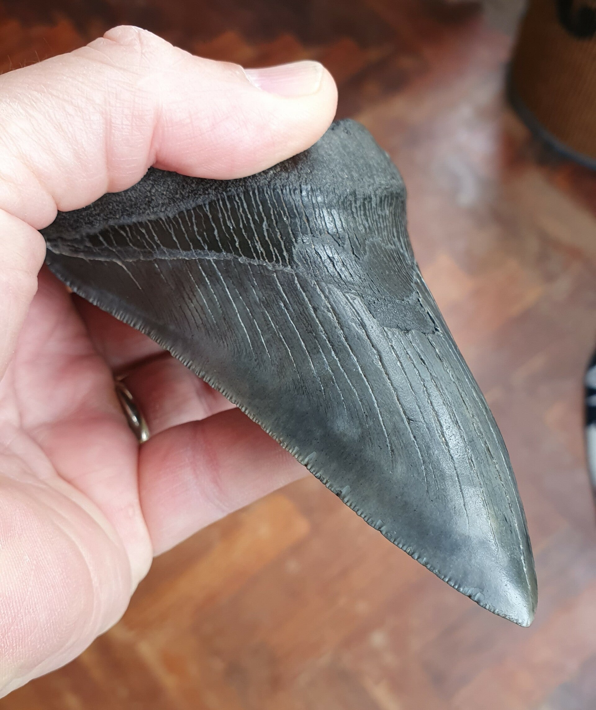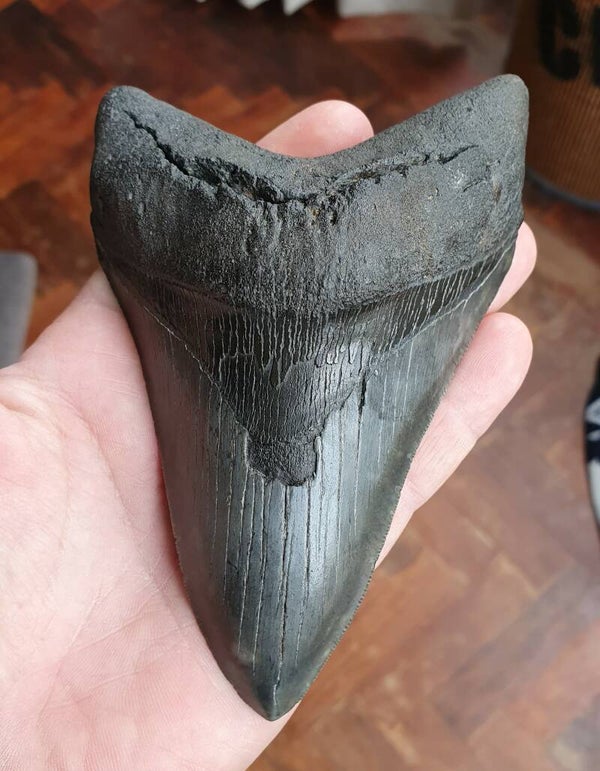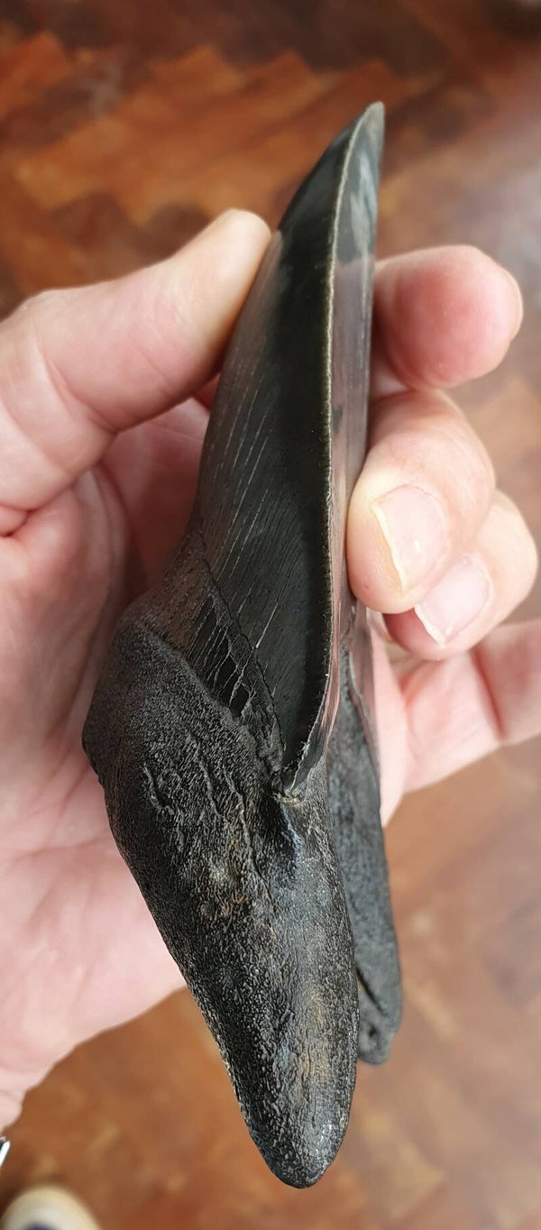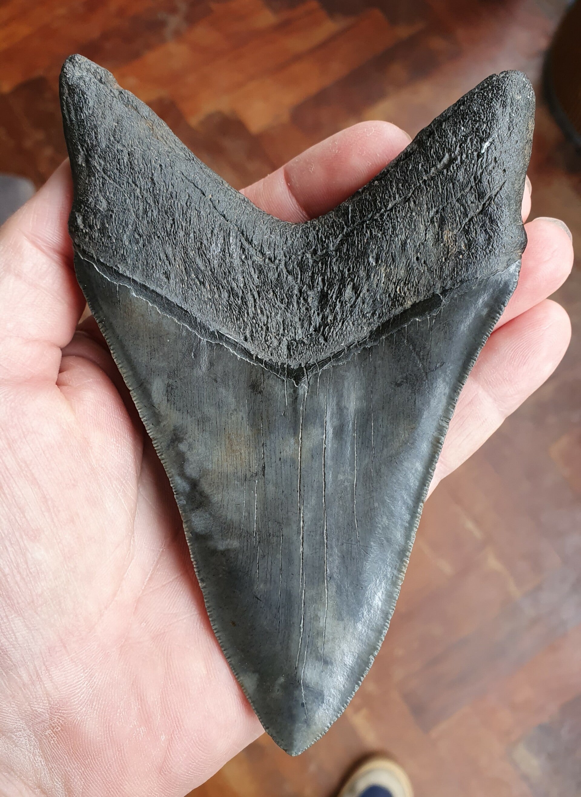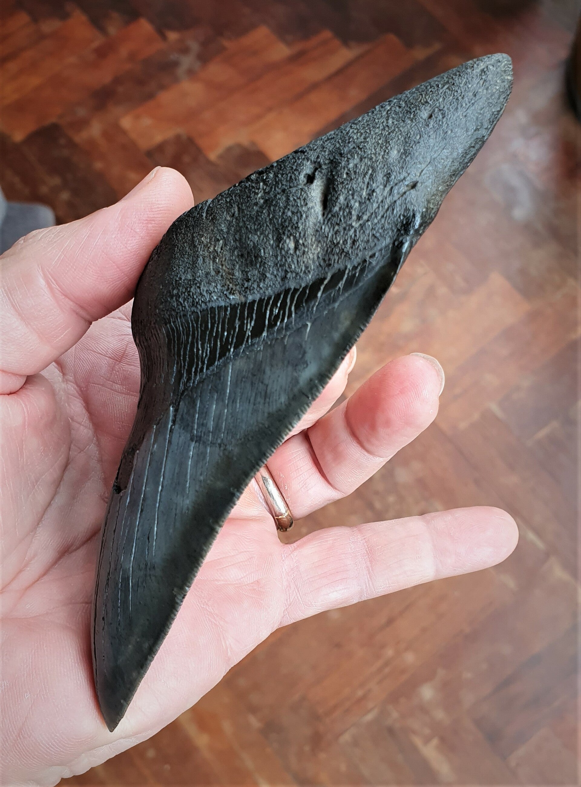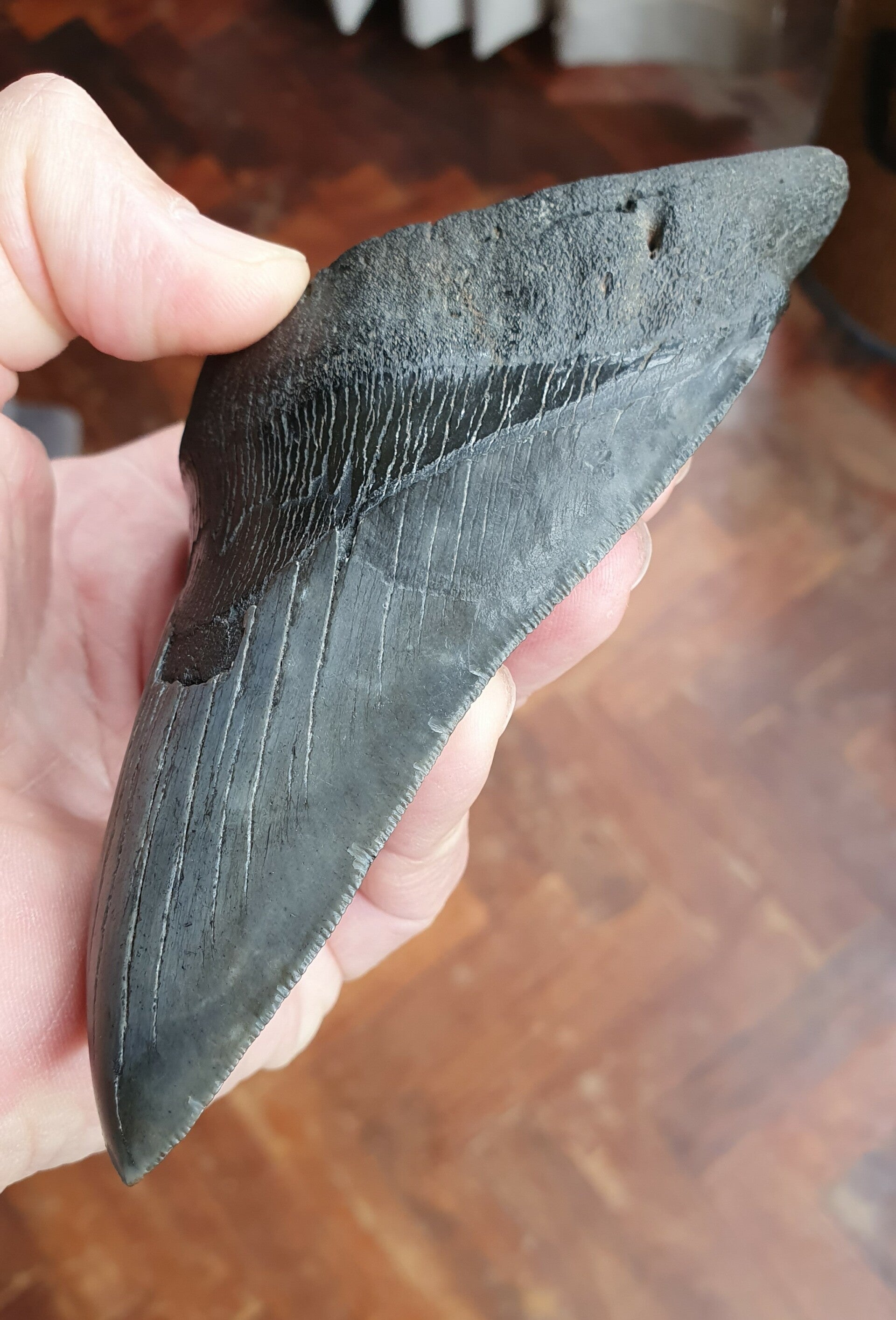 Megalodon tand uit South Carolina, USA. Afmeting 14,2 cm.
