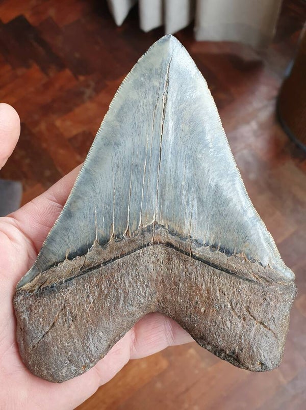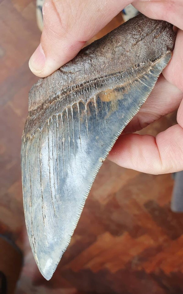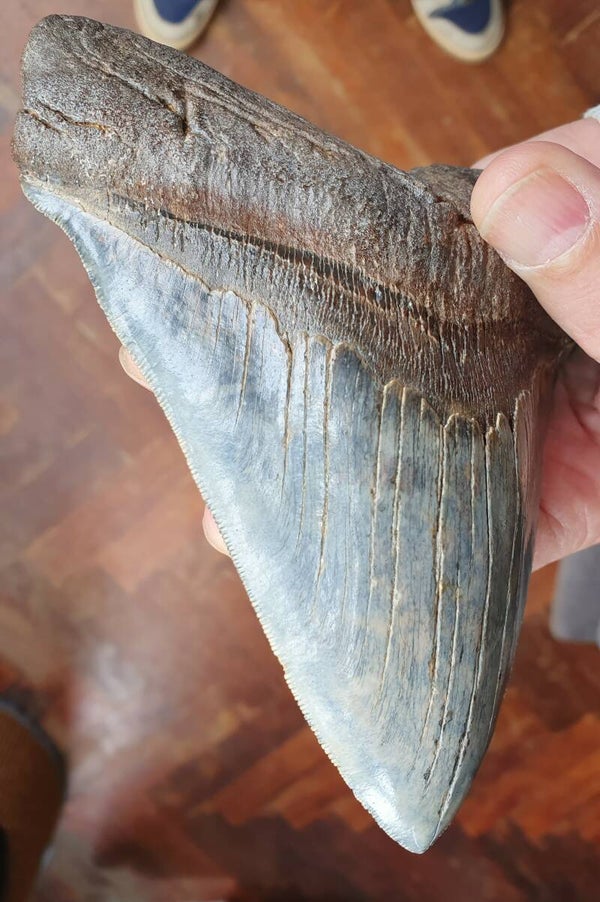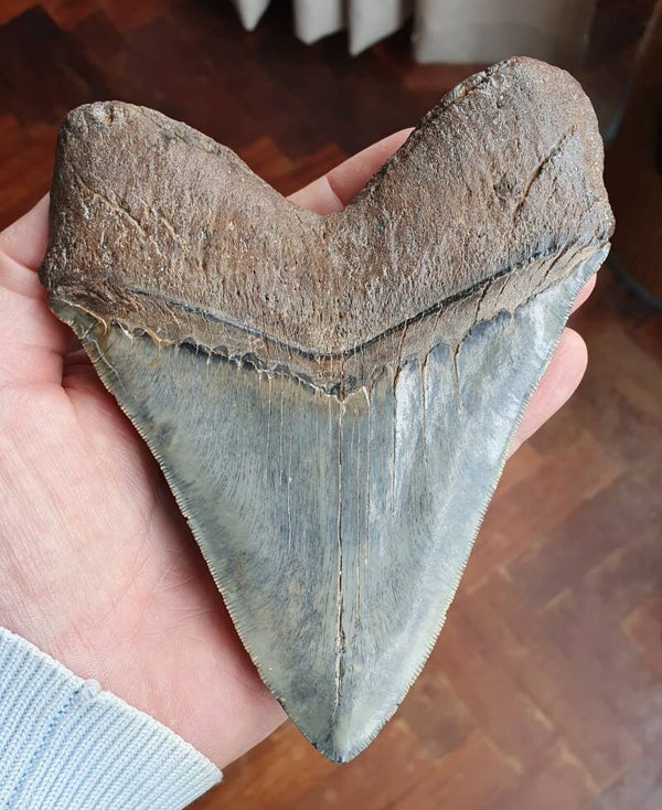 Baluwe Megalodon tand uit South Carolina, USA. Afmeting 14,5 cm.