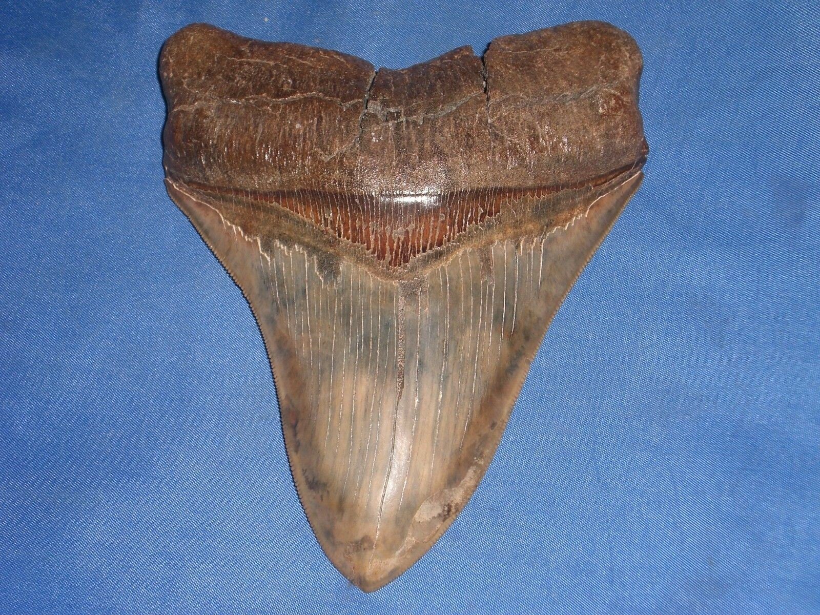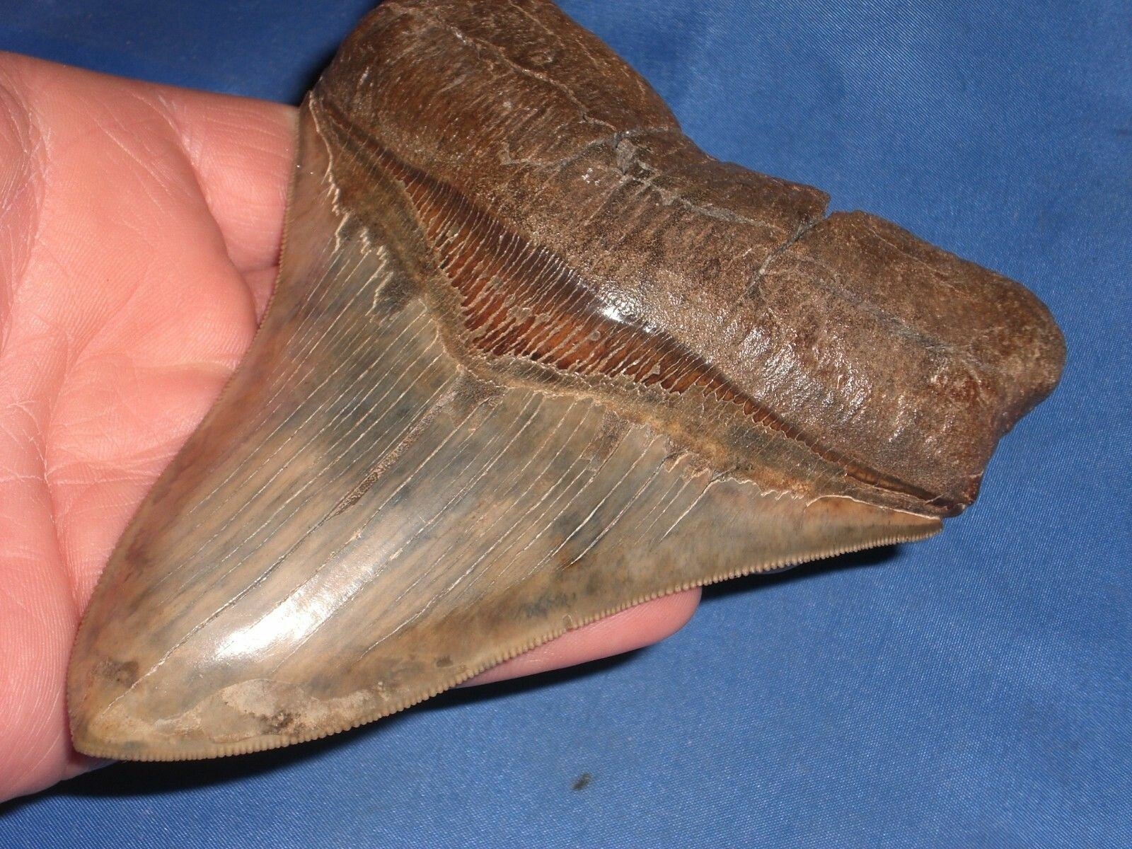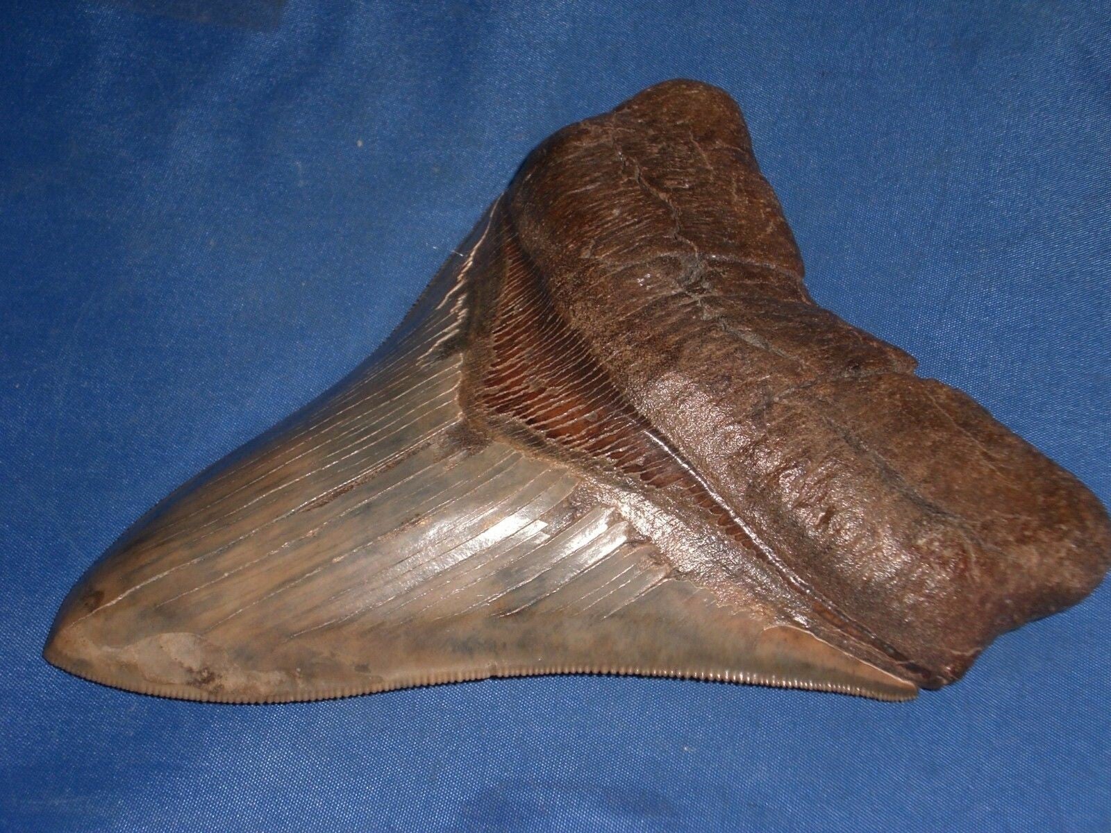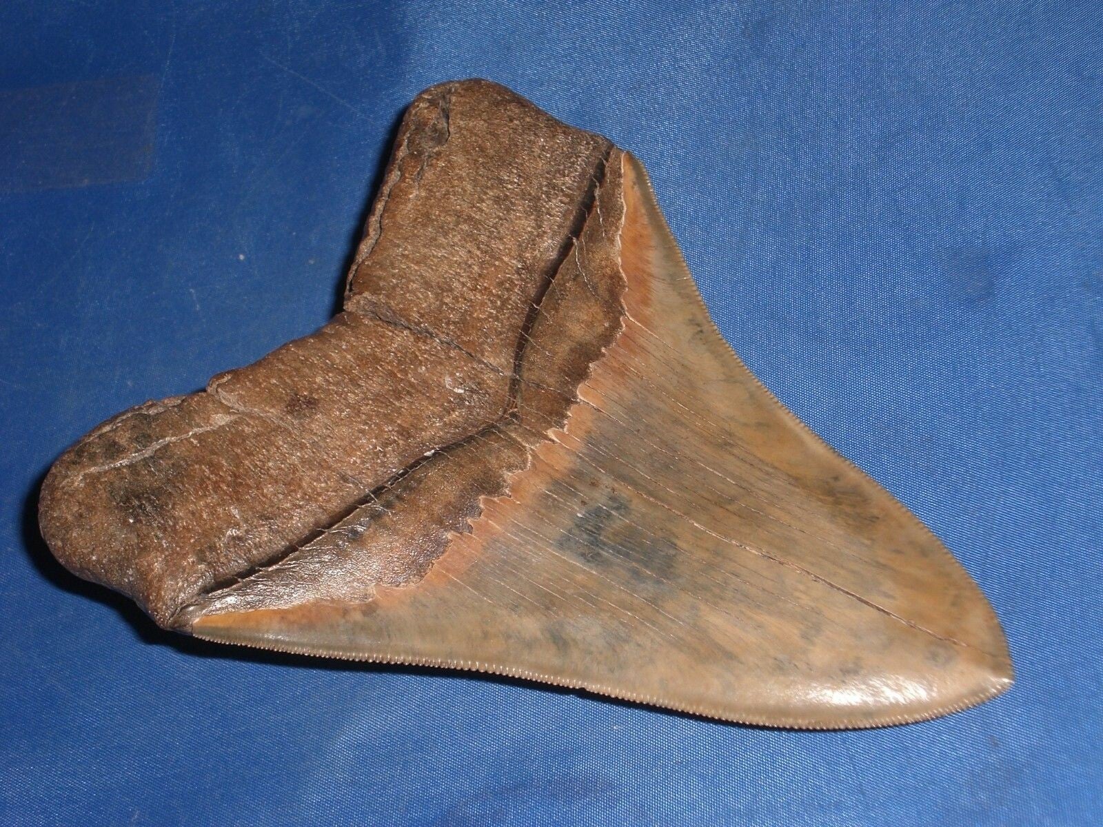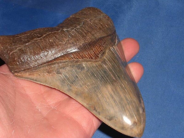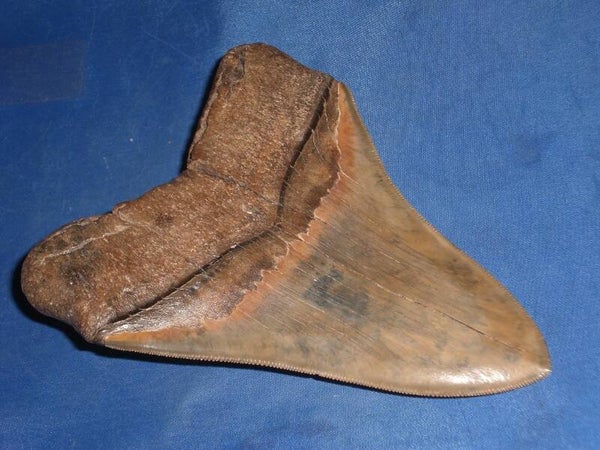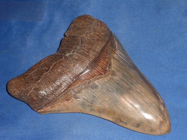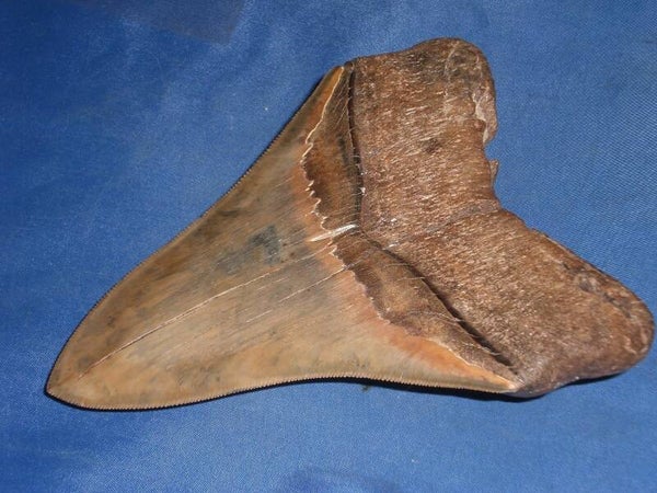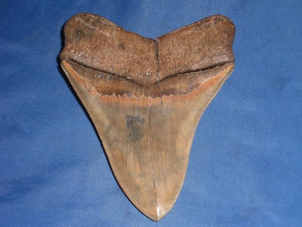 Grote Megalodon haaientand, Broad river, South Carolina, USA, 13.7 cm. Pefecte serraties en tip, mooie bruine kleur.