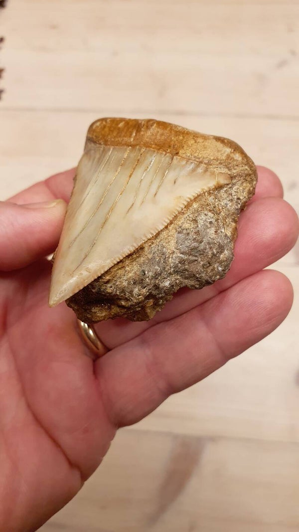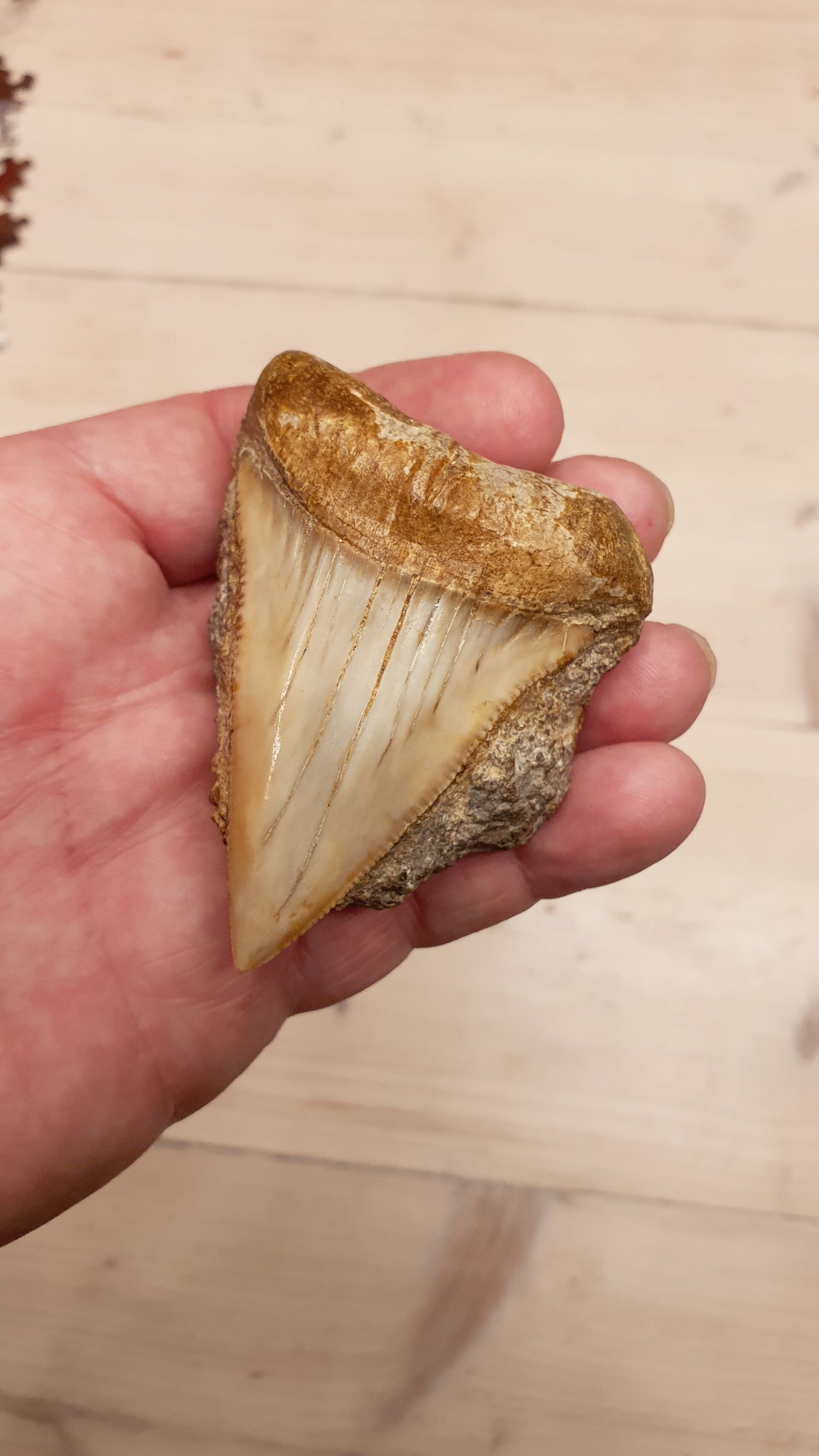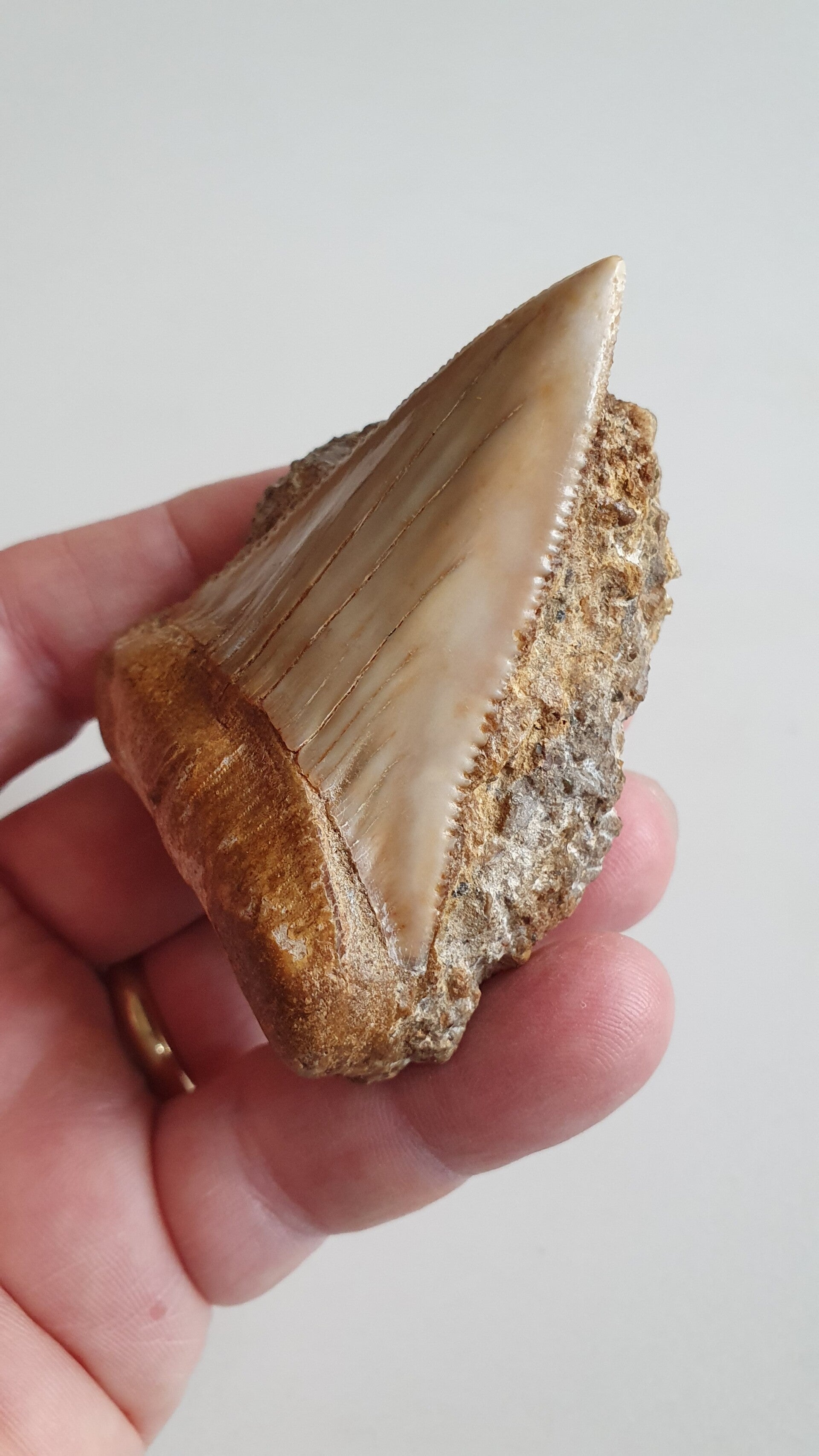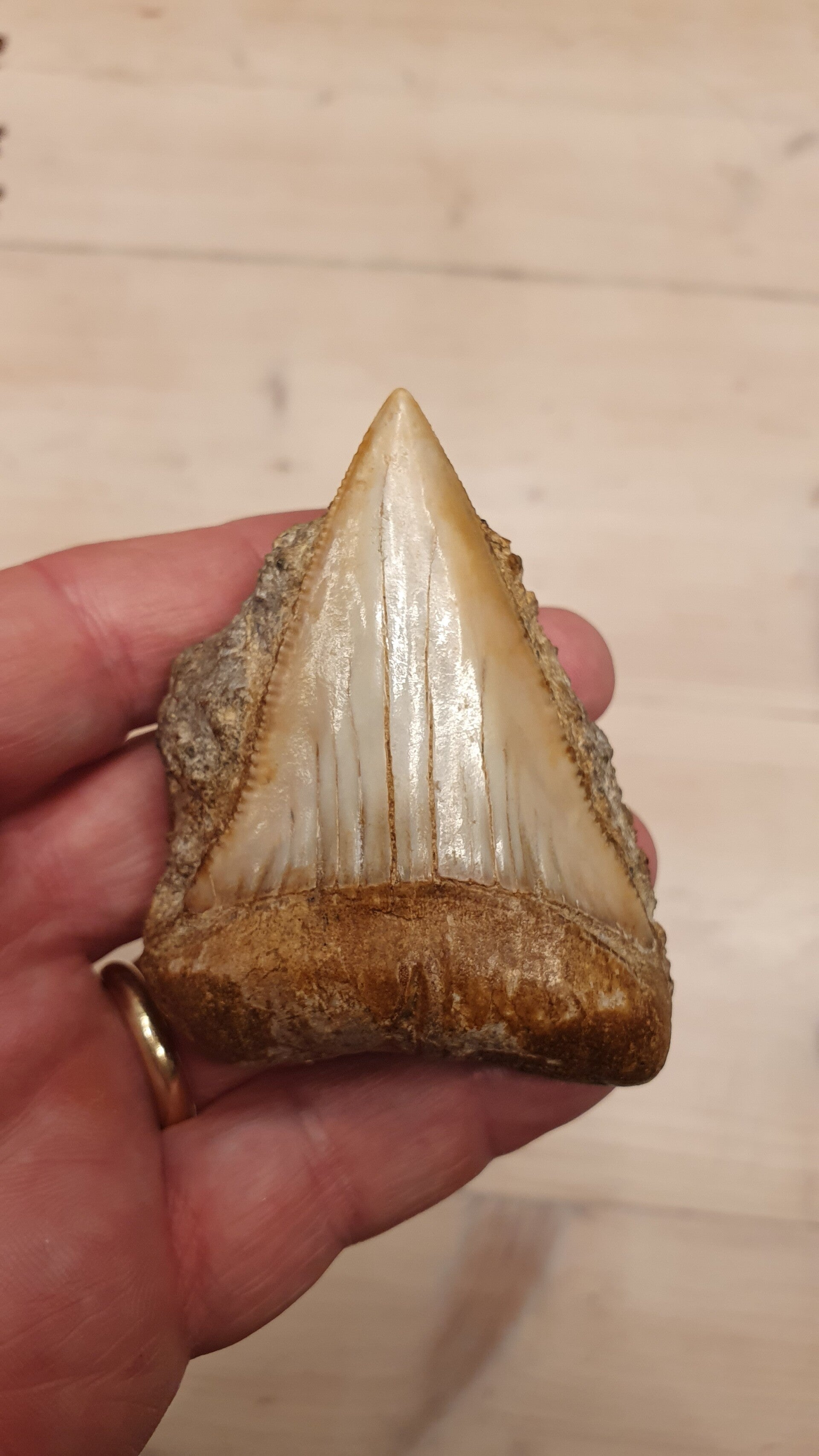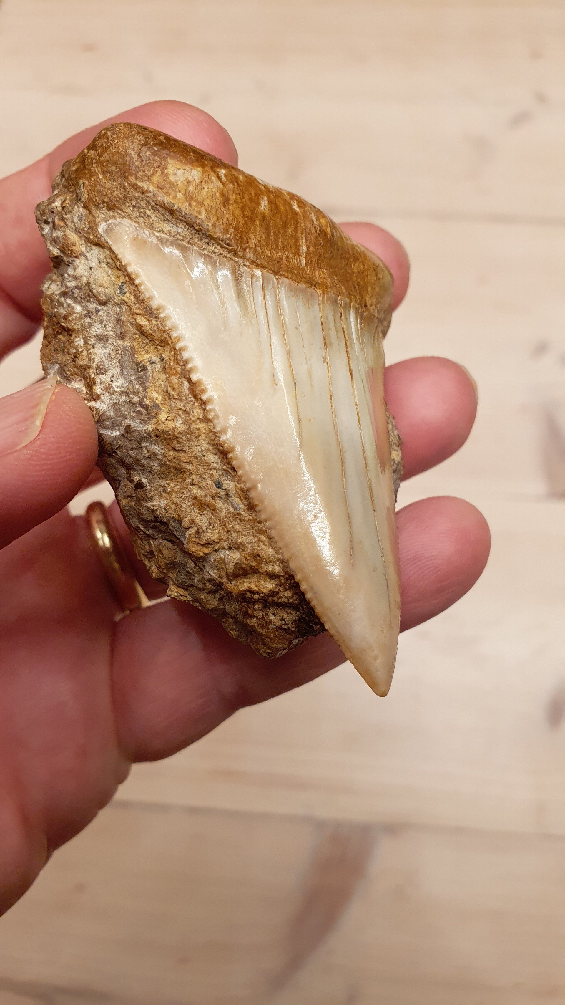 Extreem zeldzame en grote Great White uit Atacama desert, Chili. Afmeting 7,1 cm. Er komen al jaren geen tanden op de markt uit Chili vanwege een export verbod. Deze is dan ook uit een oude collectie. Mooi in Matrix.