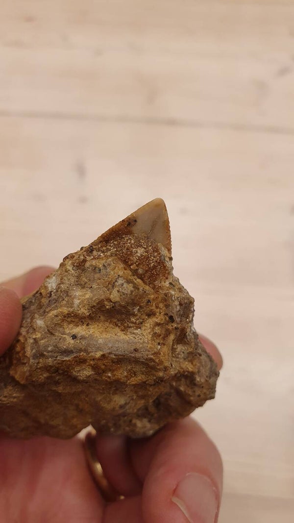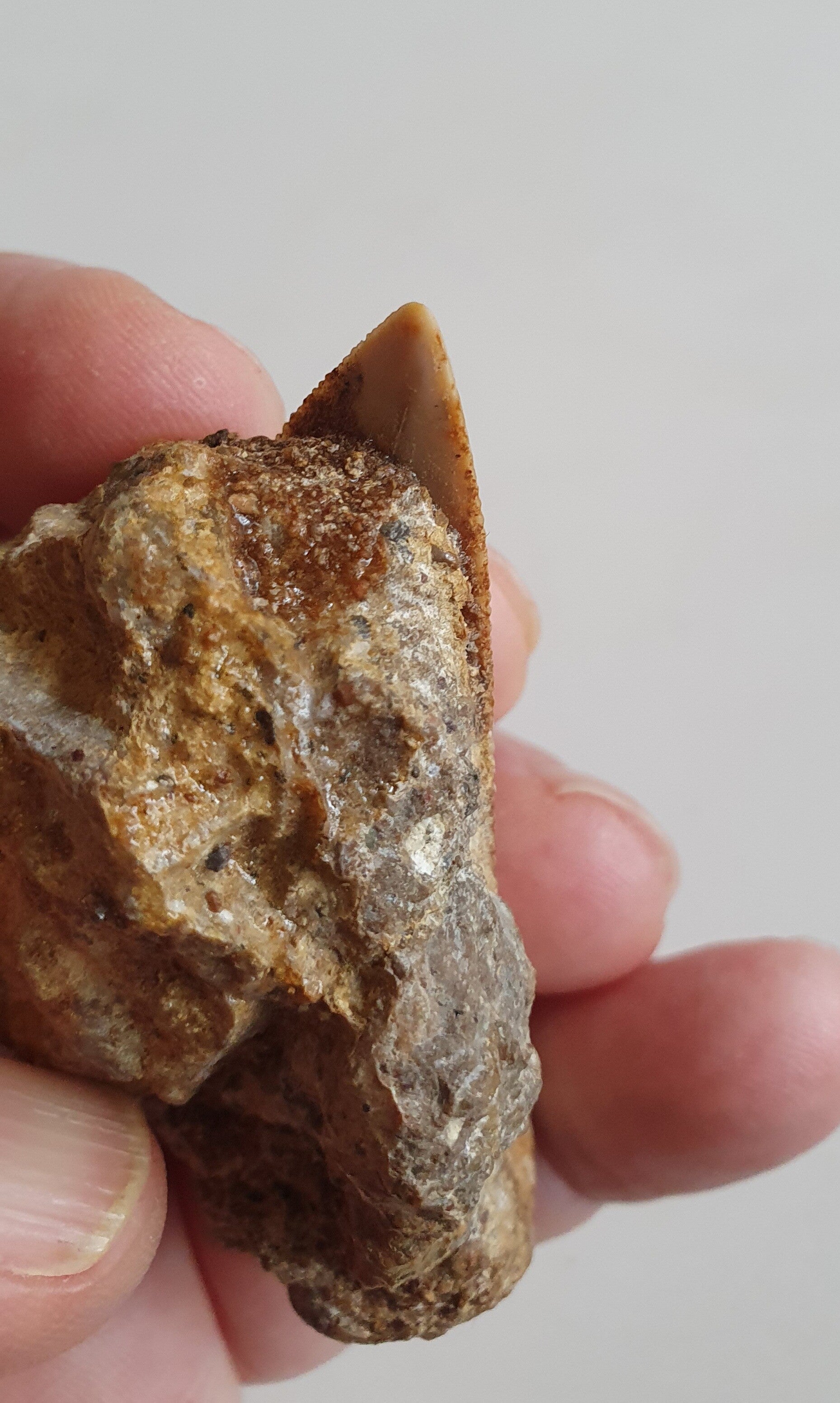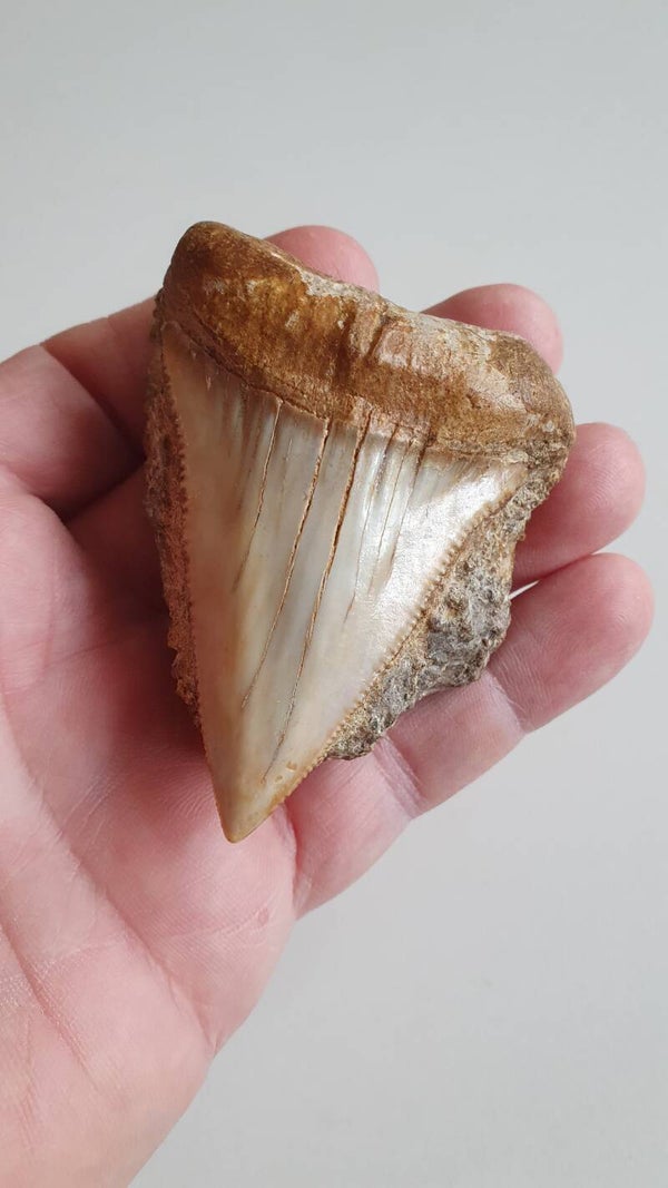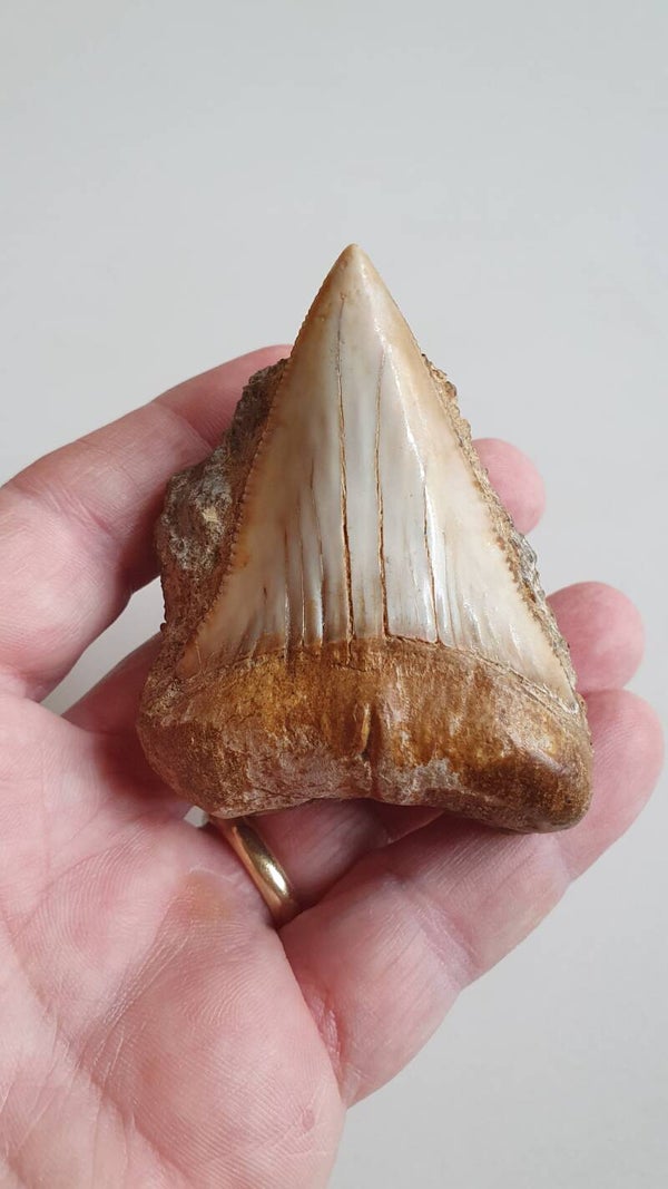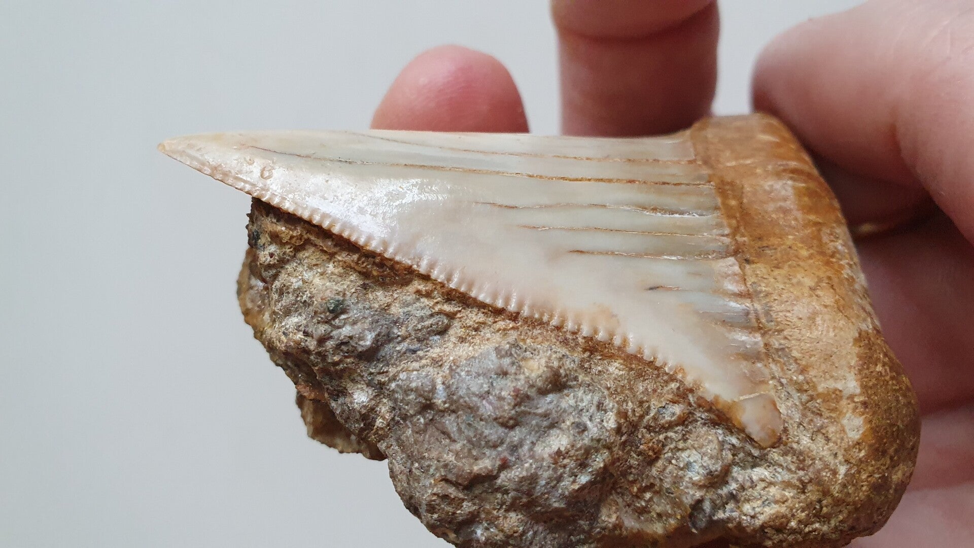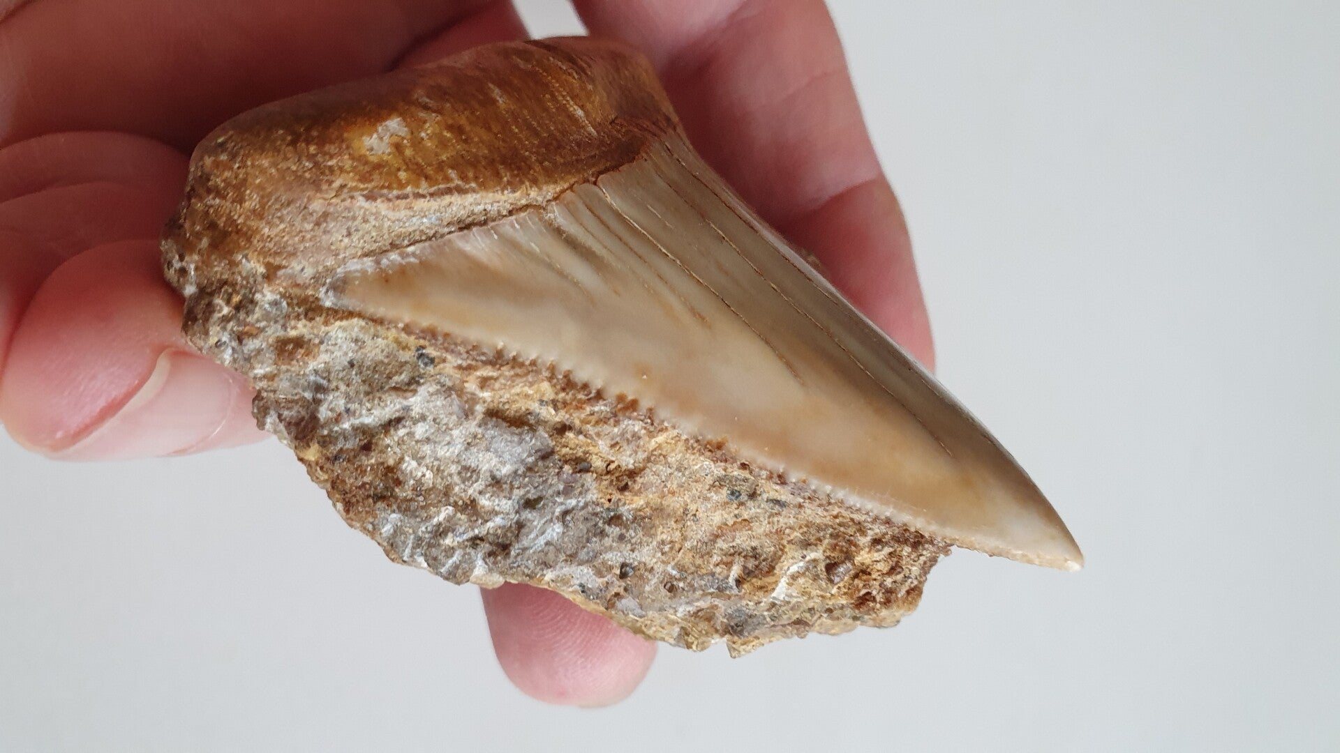 Extreem zeldzame en grote Great White uit Atacama desert, Chili. Afmeting 7,1 cm. Er komen al jaren geen tanden op de markt uit Chili vanwege een export verbod. Deze is dan ook uit een oude collectie. Mooi in Matrix.