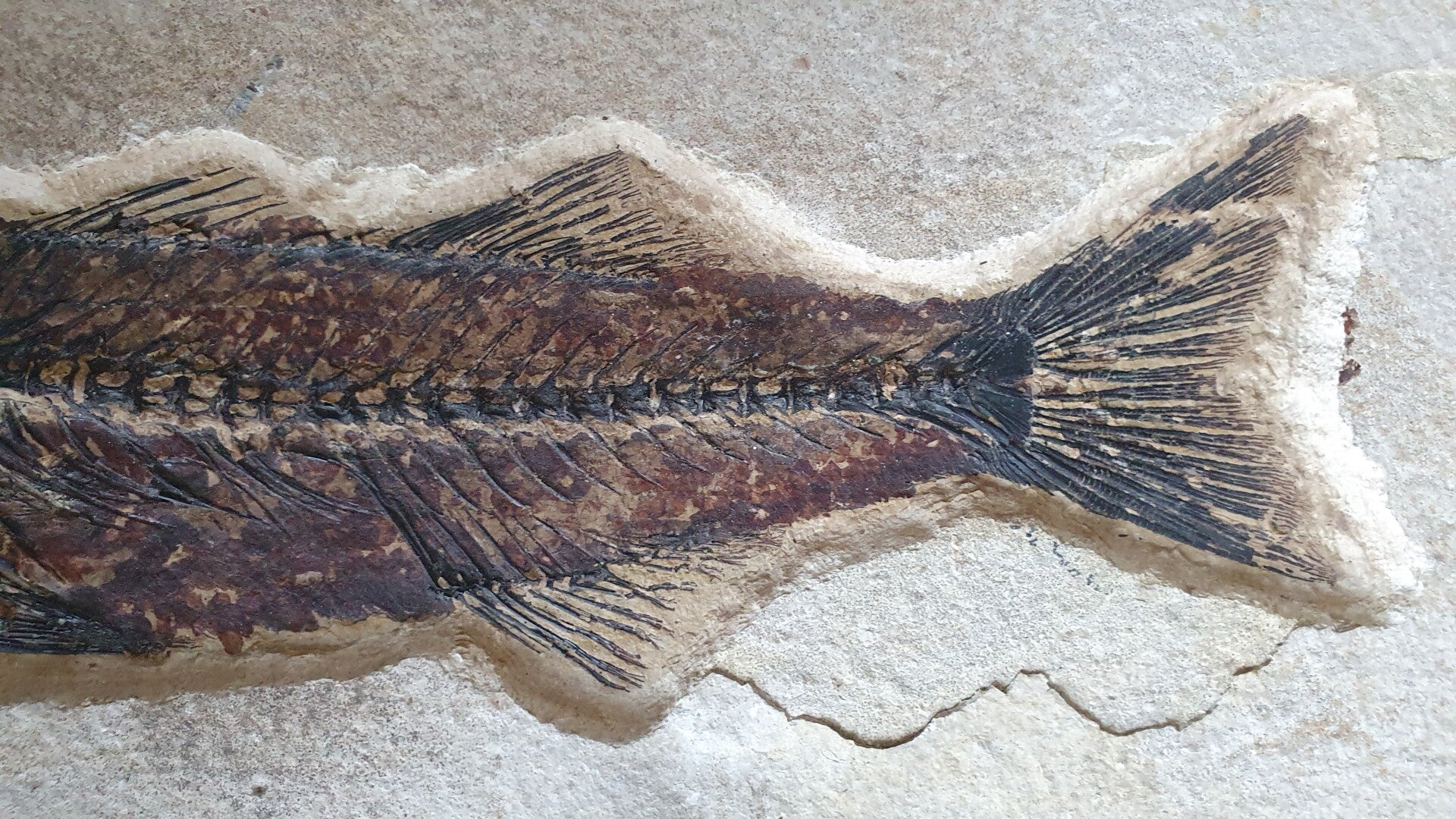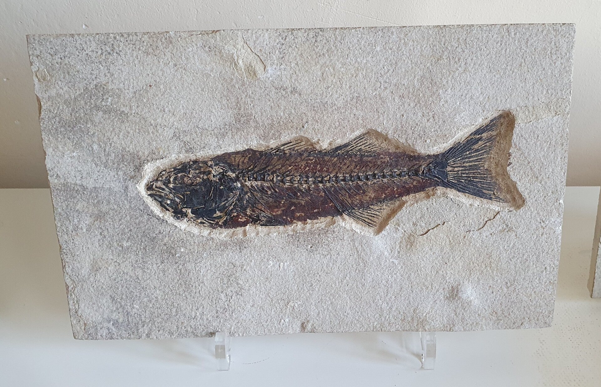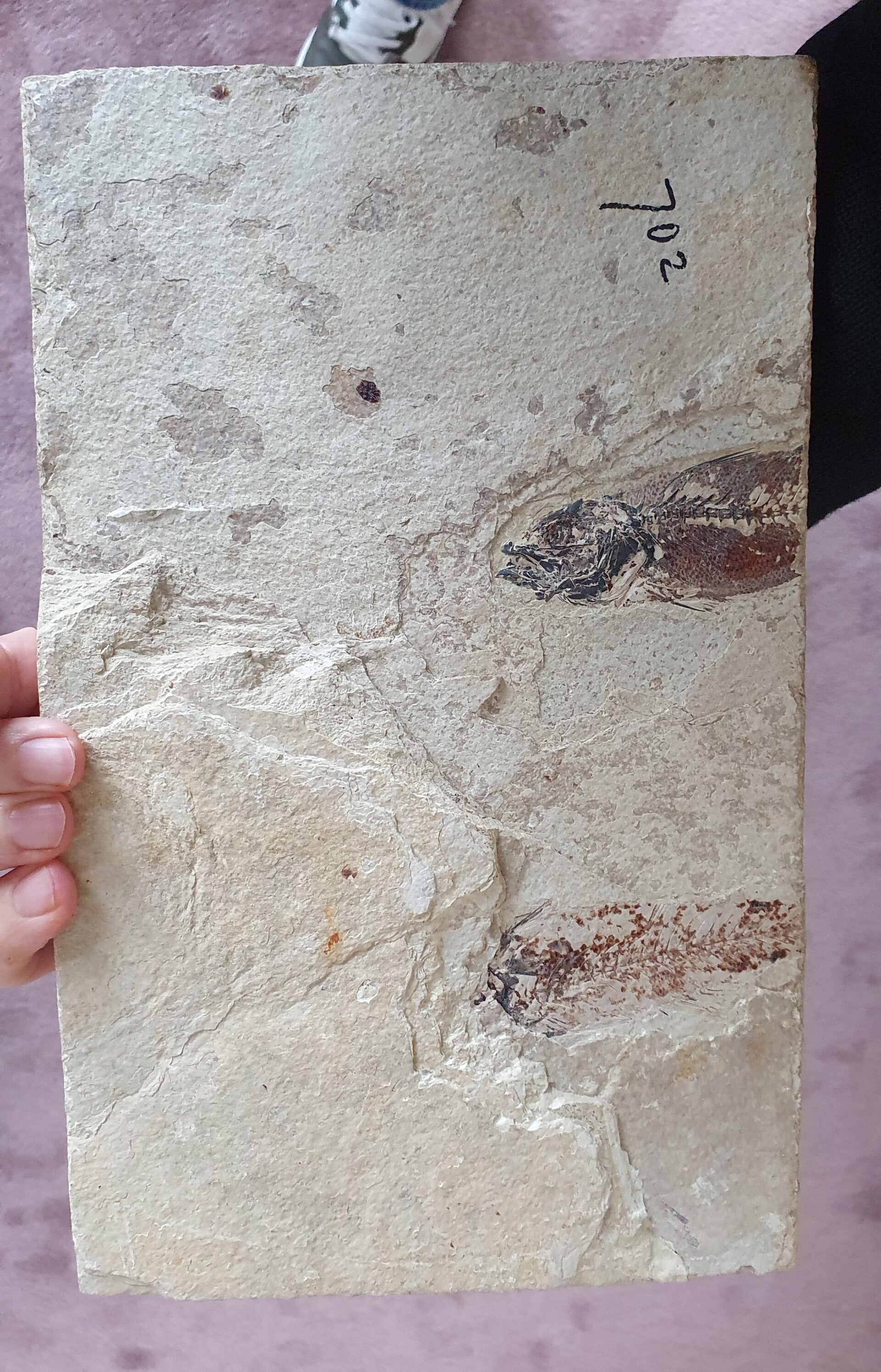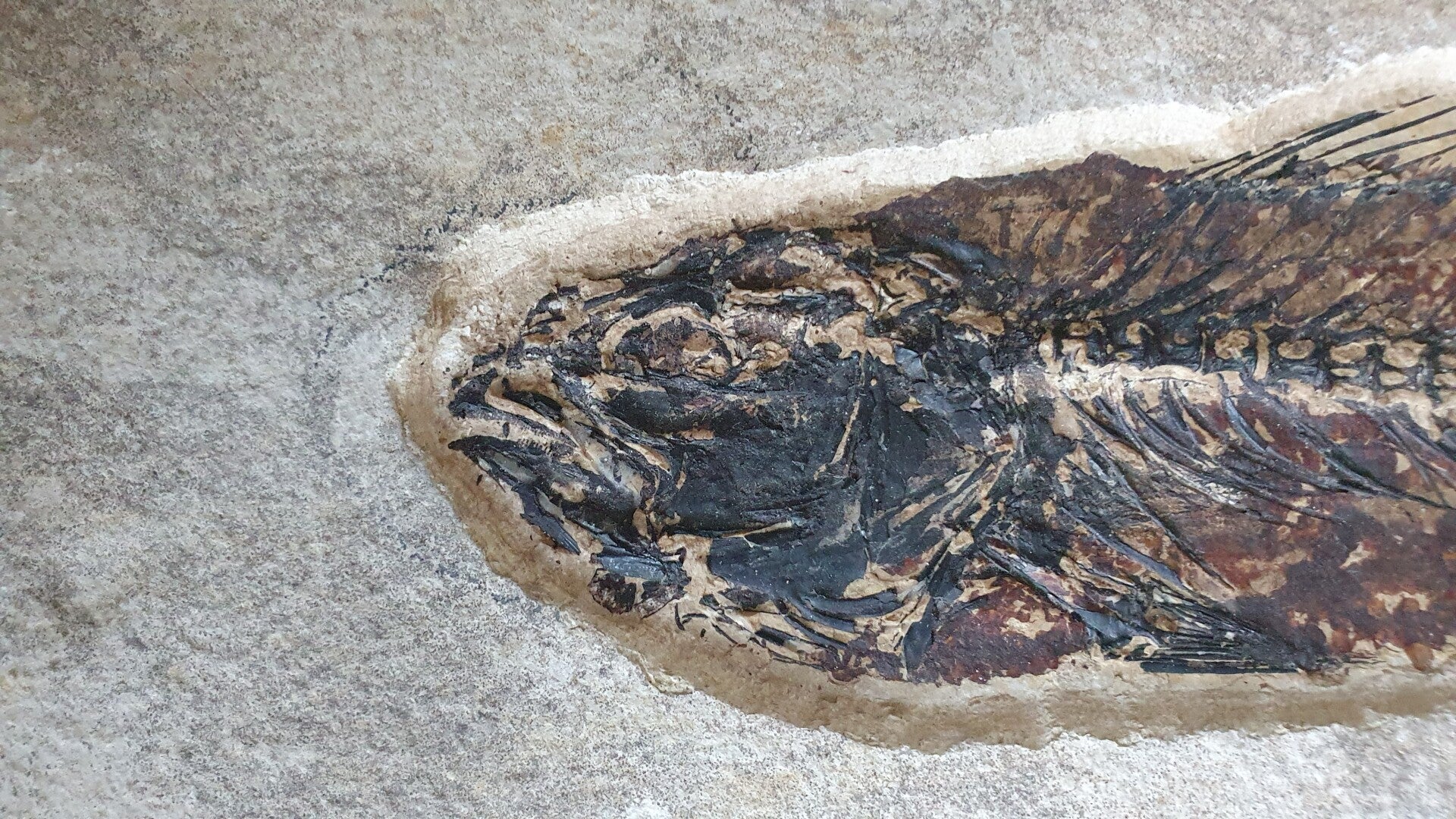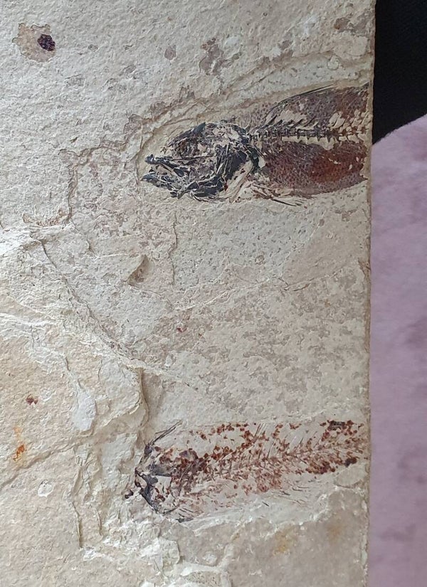 Grote Mioplosus vis met nog 2 vissen op de achterkant van de matrix. Afmeting 20 cm (op matrix van 29x18 cm)Natuurlijk, zonder restauratie